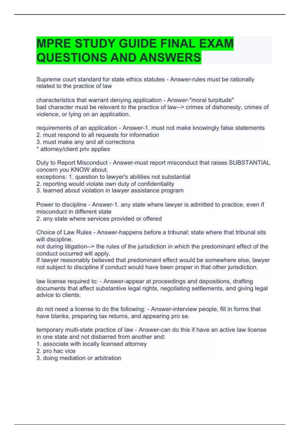 MPRE STUDY GUIDE FINAL EXAM QUESTIONS AND ANSWERS