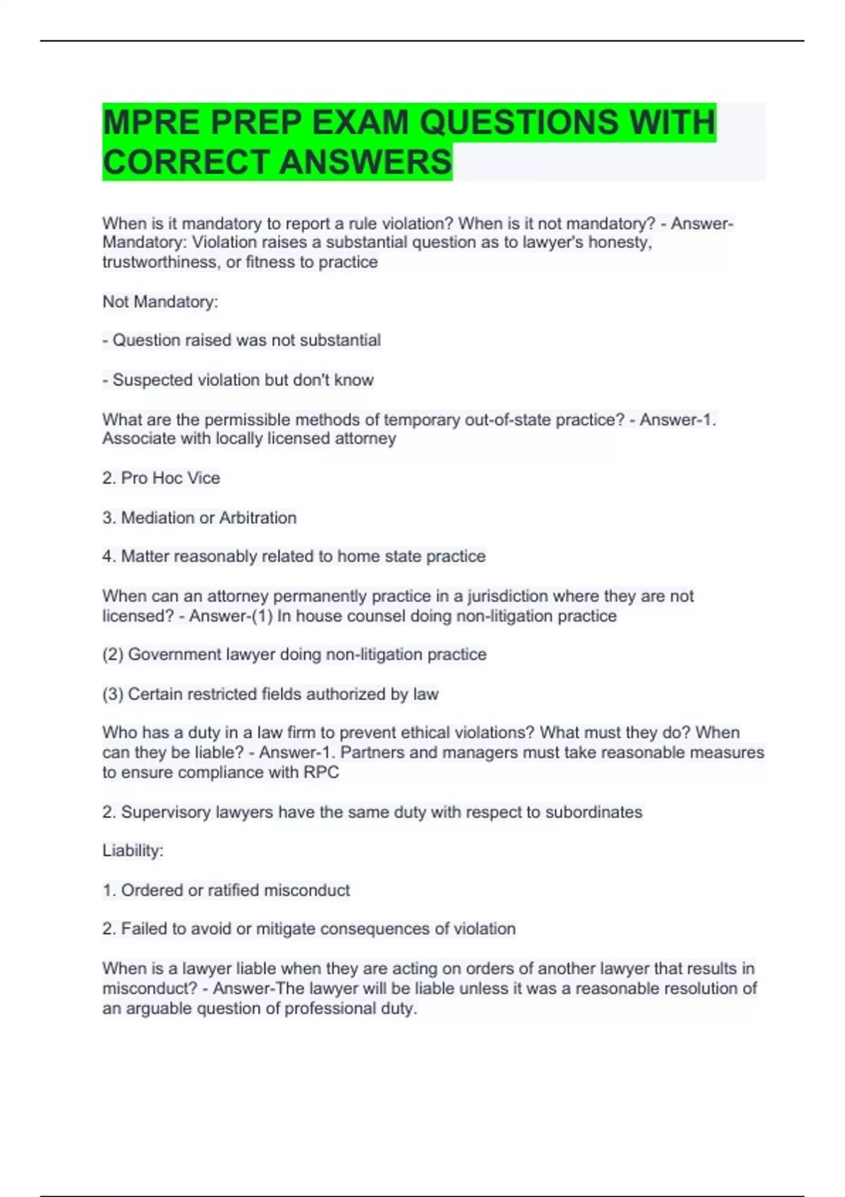 MPRE PREP EXAM QUESTIONS WITH CORRECT ANSWERS