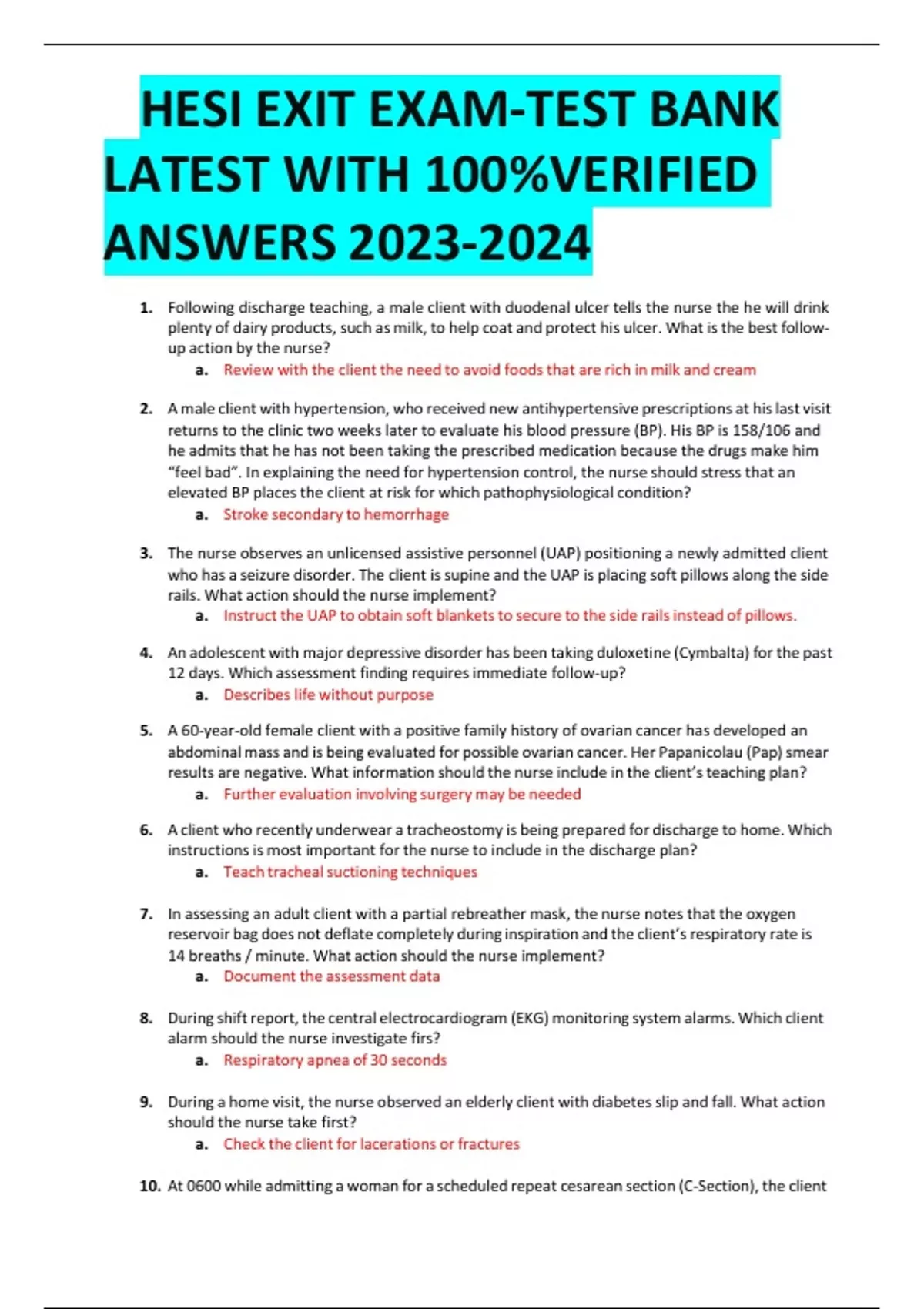 HESI EXIT EXAM-TEST BANK LATEST WITH 100%VERIFIED ANSWERS