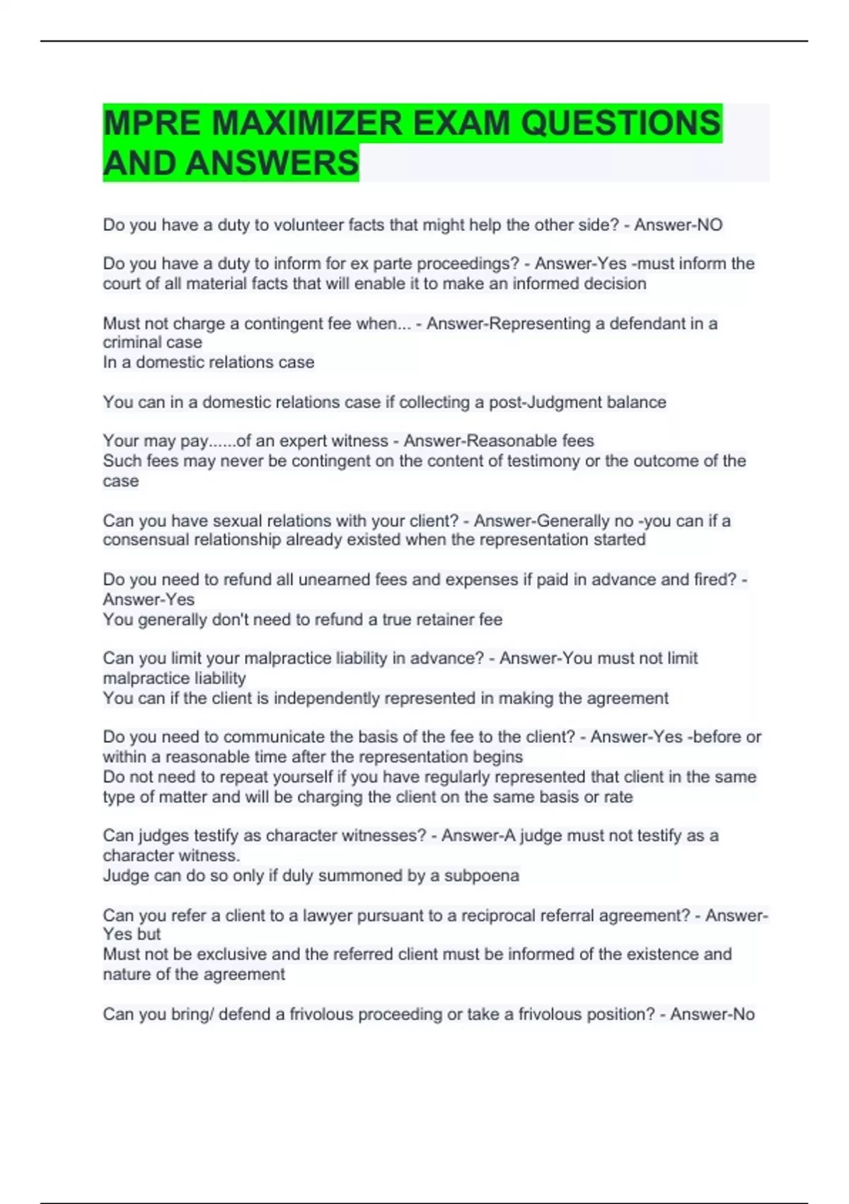 MPRE MAXIMIZER EXAM QUESTIONS AND ANSWERS