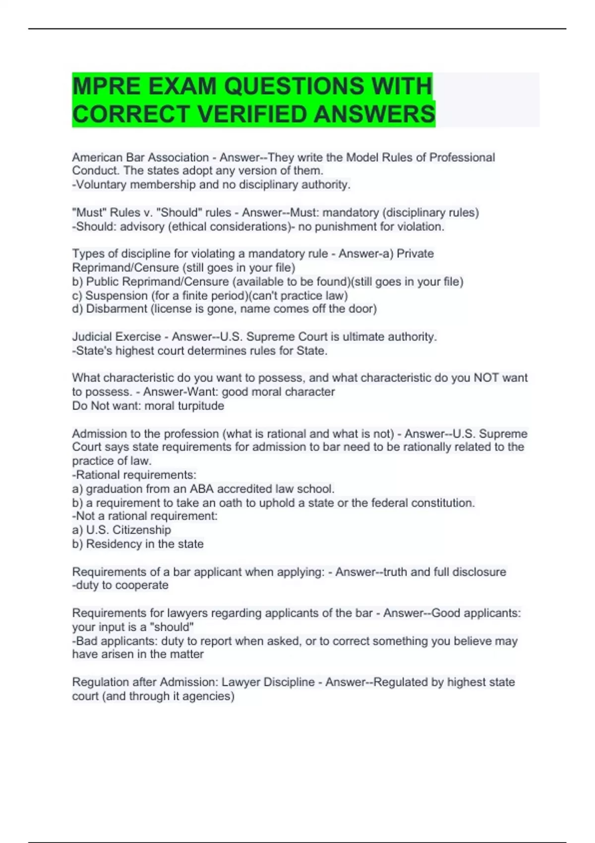 MPRE EXAM QUESTIONS WITH CORRECT VERIFIED ANSWERS Relationship of the Dual Profession Lawyer with Non-lawyers - Answer-Yes, it's okay to tell people your dual professions. Dual Profession Lawyer: Soliciting legal business - Answer--Can't use dual profession to solicit Dual Profession Lawyer: Attorney/Client privilege - Answer--Does not apply in the dual profession Dual Profession: Ancillary Services - Answer--Law related services. -Okay to provide reasonably performed in conjunction and related to legal services, and note: 1) non legal and legal provided together: the Rules apply to both. 2) non legal services provided by entity controlled by the lawyer: lawyer must assure that client knows of their interest and that it is not legal services. failure to do so will mean that the Rules apply to every service. Ancillary Services - Answer--law related services Restrictions on Right to Practice - Answer--Non-compete clauses are NOT acceptable. -Exceptions: 1) condition of retirement 2) condition of settling a claim between lawyers at a firm Duty of a solo practitioner to plan for death - Answer--A Solo Practitioner has a special duty to plan for death or disability by designating another competent lawyer to review the files, notify clients, and take protective action. Do lawyers have to take cases? - Answer--No, lawyers have general freedom to reject cases. -Exceptions: 1) defenseless or oppressed (should take these) 2) Fair share of pro bono (should take these)- 50 hours per year recommended 3) Appointments by judge (MUST take these) How many hours of pro bono are recommended per year? - Answer-50 hours What is good cause not to take on a case? When is there a duty to reject a case? - Answer-1) unreasonable financial burden 2) duty to reject cases: -physical or mental inability -conflict of interest -frivolous claim or defense -strong feelings or bias -incompetence/lacking the legal expertise (ex: different specialty)