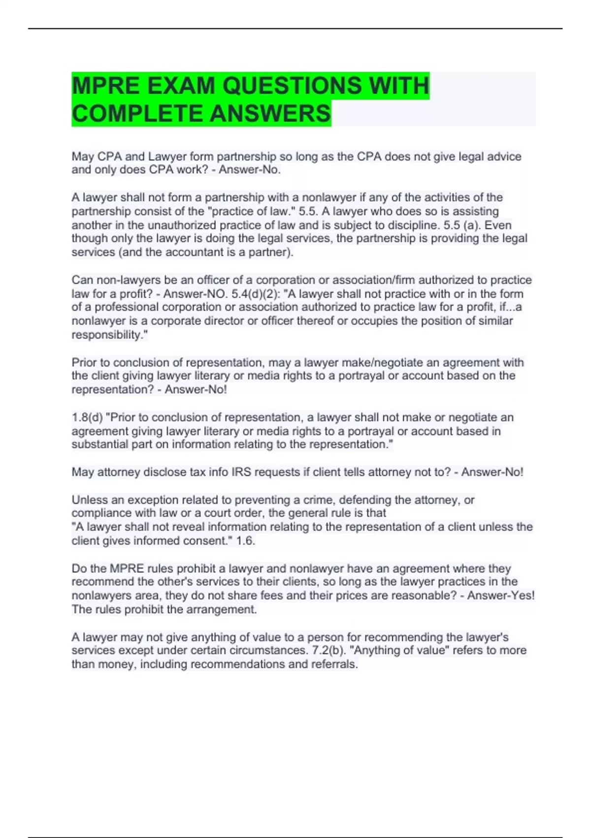 MPRE EXAM QUESTIONS WITH COMPLETE ANSWERS