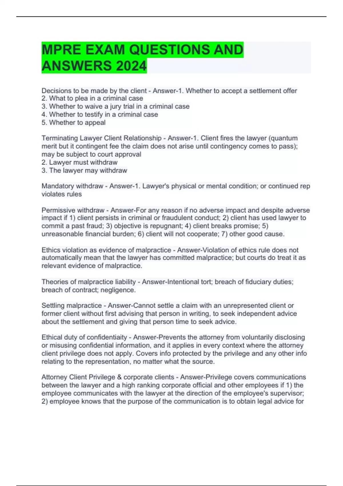 MPRE EXAM QUESTIONS AND ANSWERS 2024