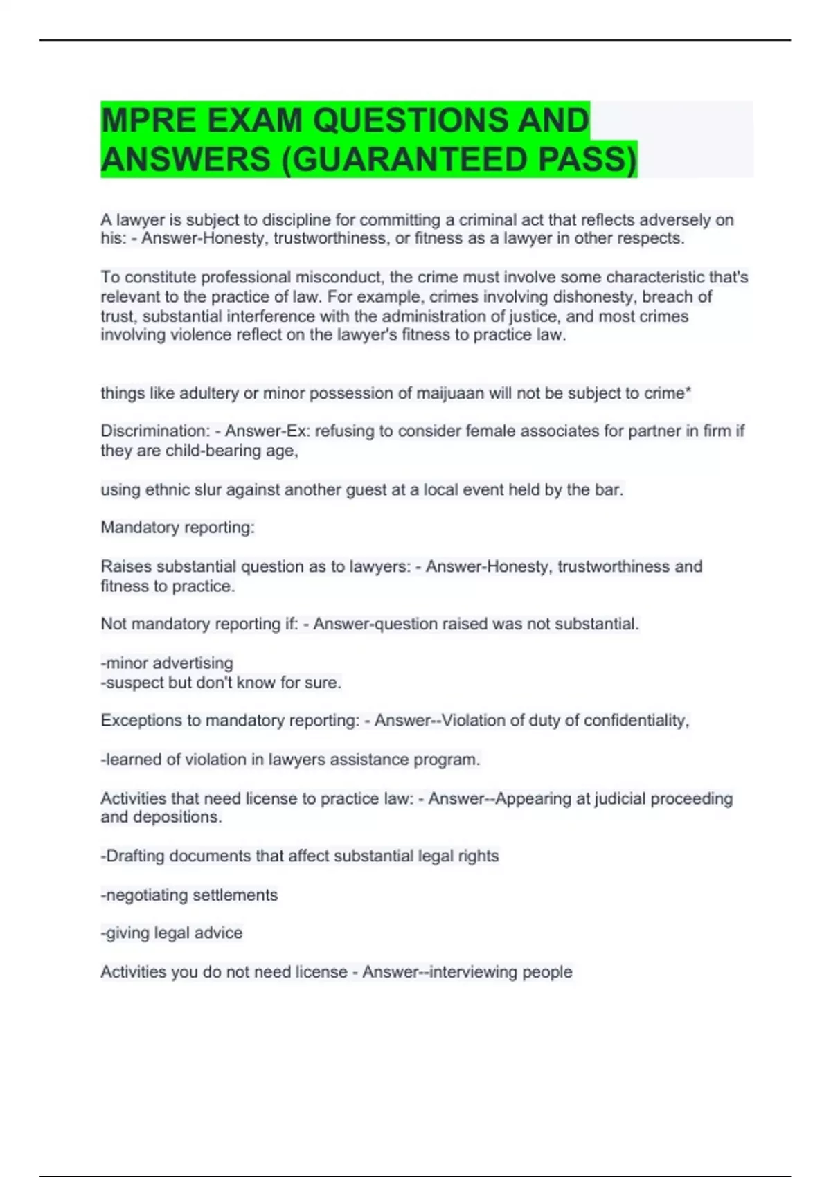 MPRE EXAM QUESTIONS AND ANSWERS (GUARANTEED PASS)