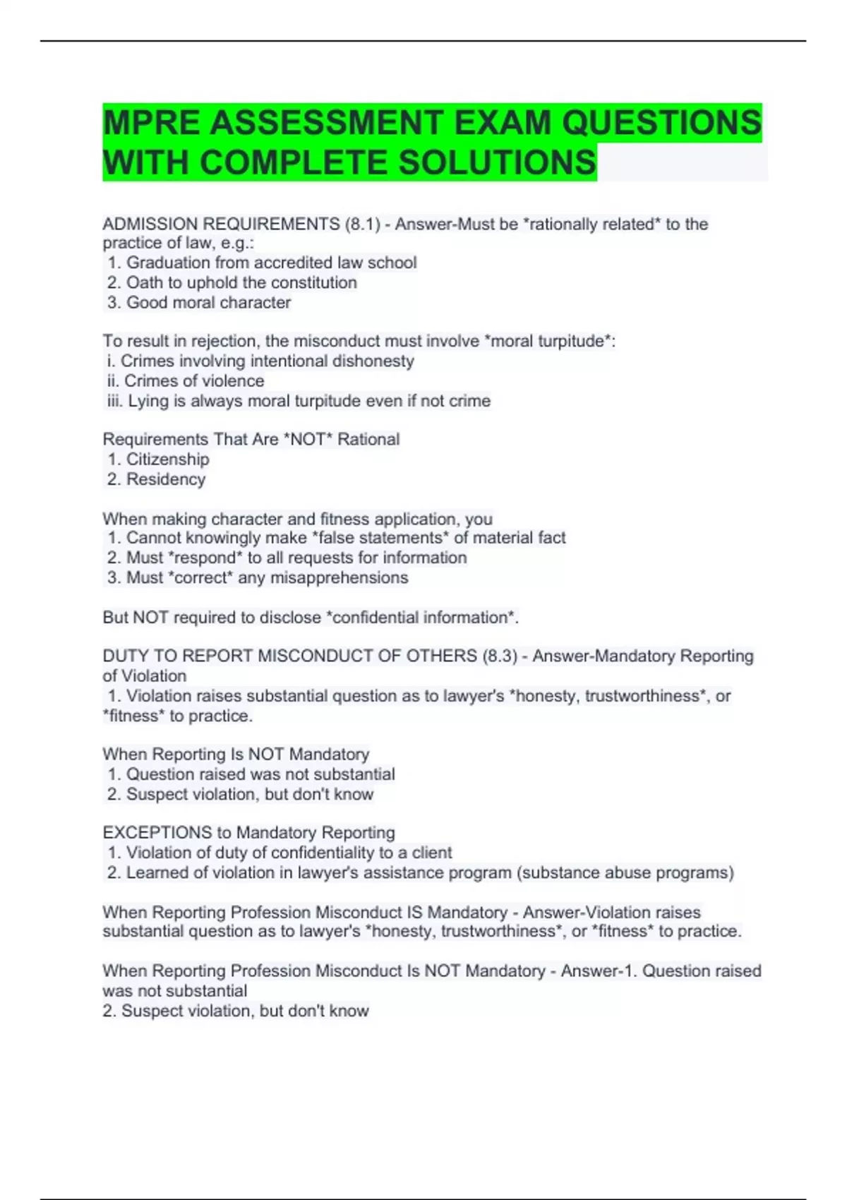 MPRE ASSESSMENT EXAM QUESTIONS WITH COMPLETE SOLUTIONS