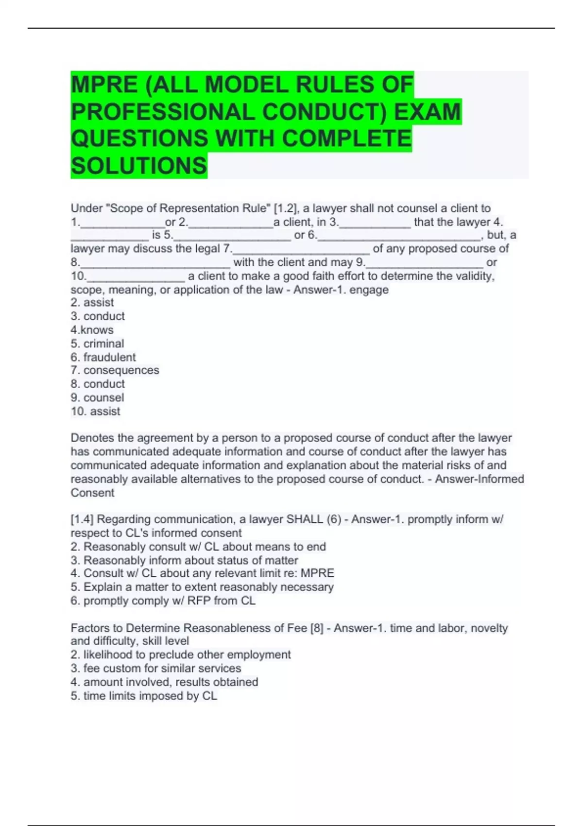 MPRE (ALL MODEL RULES OF PROFESSIONAL CONDUCT) EXAM QUESTIONS WITH COMPLETE SOLUTIONS