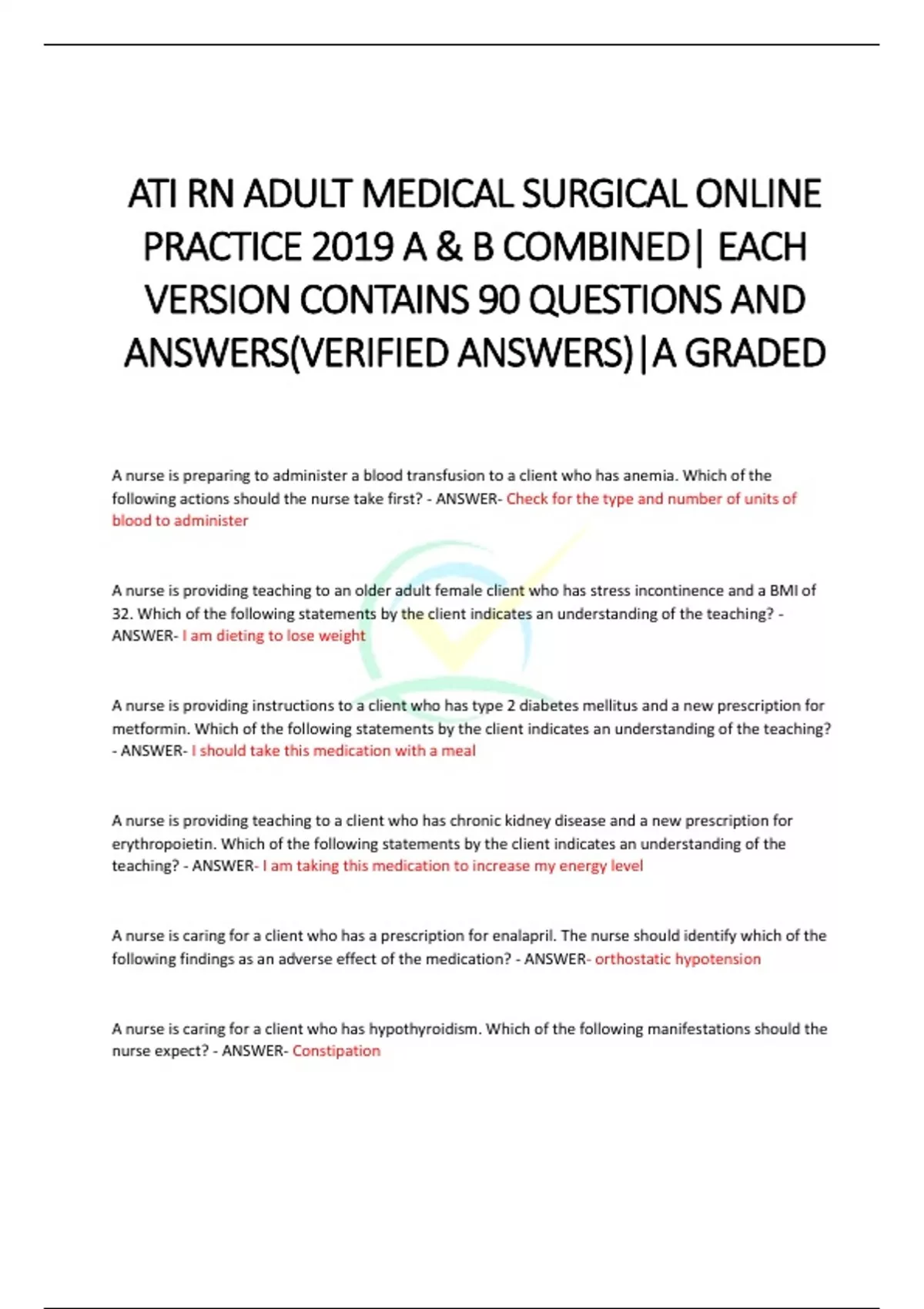 ATI RN ADULT MEDICAL SURGICAL ONLINE PRACTICE 2019 A & B COMBINED| EACH VERSION CONTAINS 90 QUESTIONS AND ANSWERS(VERIFIED ANSWERS)|A GRADED