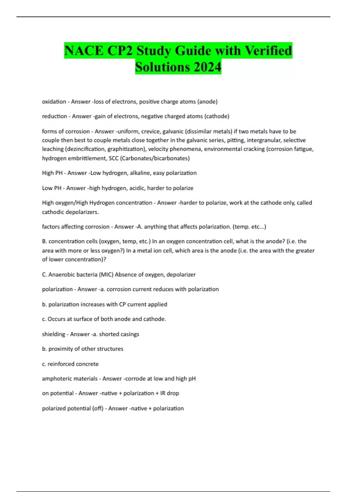 NACE CP2 Study Guide with Verified Solutions 2024 oxidation - Answer -loss of electrons, positive charge atoms (anode) reduction - Answer -gain of electrons, negative charged atoms (cathode) forms of corrosion - Answer -uniform, crevice, galvanic (dissimilar metals) if two metals have to be couple then best to couple metals close together in the galvanic series, pitting, intergranular, selective leaching (dezincification, graphitization), velocity phenomena, environmental cracking (corrosion fatigue, hydrogen embrittlement, SCC (Carbonates/bicarbonates) High PH - Answer -Low hydrogen, alkaline, easy polarization Low PH - Answer -high hydrogen, acidic, harder to polarize High oxygen/High Hydrogen concentration - Answer -harder to polarize, work at the cathode only, called cathodic depolarizers. factors affecting corrosion - Answer -A. anything that affects polarization. (temp. etc...) B. concentration cells (oxygen, temp, etc.) In an oxygen concentration cell, what is the anode? (i.e. the area with more or less oxygen?) In a metal ion cell, which area is the anode (i.e. the area with the greater of lower concentration)? C. Anaerobic bacteria (MIC) Absence of oxygen, depolarizer polarization - Answer -a. corrosion current reduces with polarization b. polarization increases with CP current applied c. Occurs at surface of both anode and cathode. shielding - Answer -a. shorted casings b. proximity of other structures c. reinforced concrete amphoteric materials - Answer -corrode at low and high pH on potential - Answer -native + polarization + IR drop polarized potential (off) - Answer -native + polarizationkirchoff's laws - Answer -a. voltage (series circuits) b. current (parallel circuits) faraday's law - Answer -W=KIT relates weight loss of metal in a corrosion cell with time and current flow. rate of corrosion - Answer -directly proportional to current flow cathodic protection limitations - Answer --shield