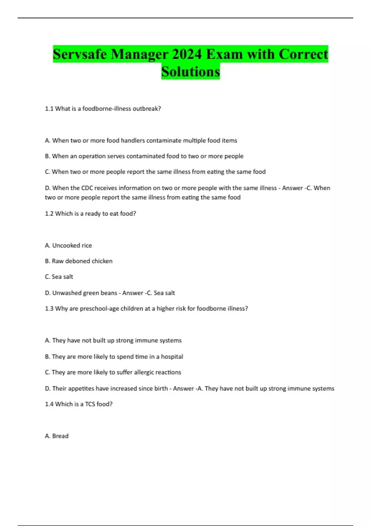Servsafe Manager 2024 Exam with Correct Solutions 1.1 What is a foodborne-illness outbreak? A. When two or more food handlers contaminate multiple food items B. When an operation serves contaminated food to two or more people C. When two or more people report the same illness from eating the same food D. When the CDC receives information on two or more people with the same illness - Answer -C. When two or more people report the same illness from eating the same food 1.2 Which is a ready to eat food? A. Uncooked rice B. Raw deboned chicken C. Sea salt D. Unwashed green beans - Answer -C. Sea salt 1.3 Why are preschool-age children at a higher risk for foodborne illness? A. They have not built up strong immune systems B. They are more likely to spend time in a hospital C. They are more likely to suffer allergic reactions D. Their appetites have increased since birth - Answer -A. They have not built up strong immune systems 1.4 Which is a TCS food? A. BreadB. Flour C. Sprouts D. Strawberries - Answer -C. Sprouts 1.5 The 5 common risk factors that can lead to foodborne illness are failing to cook food adequately, holding food at incorrect temperatures, using contaminated equipment, practicing poor personal hygiene, and A. reheating leftover food B. serving ready-to-eat food C. using single-use, disposable gloves D. purchasing food from unsafe sources - Answer -D. purchasing food from unsafe sources 1.6 Raw chicken breasts are left out at room temp on a prep table. What is the main risk that could cause a foodborne illness? A. Cross-contamination B. Poor personal hygiene C. Time-termperature abuse D. Poor cleaning and sanitizing - Answer -C. Time-temperature abuse 1.7 What is TCS food? A. Food requiring thermometer checks for security
