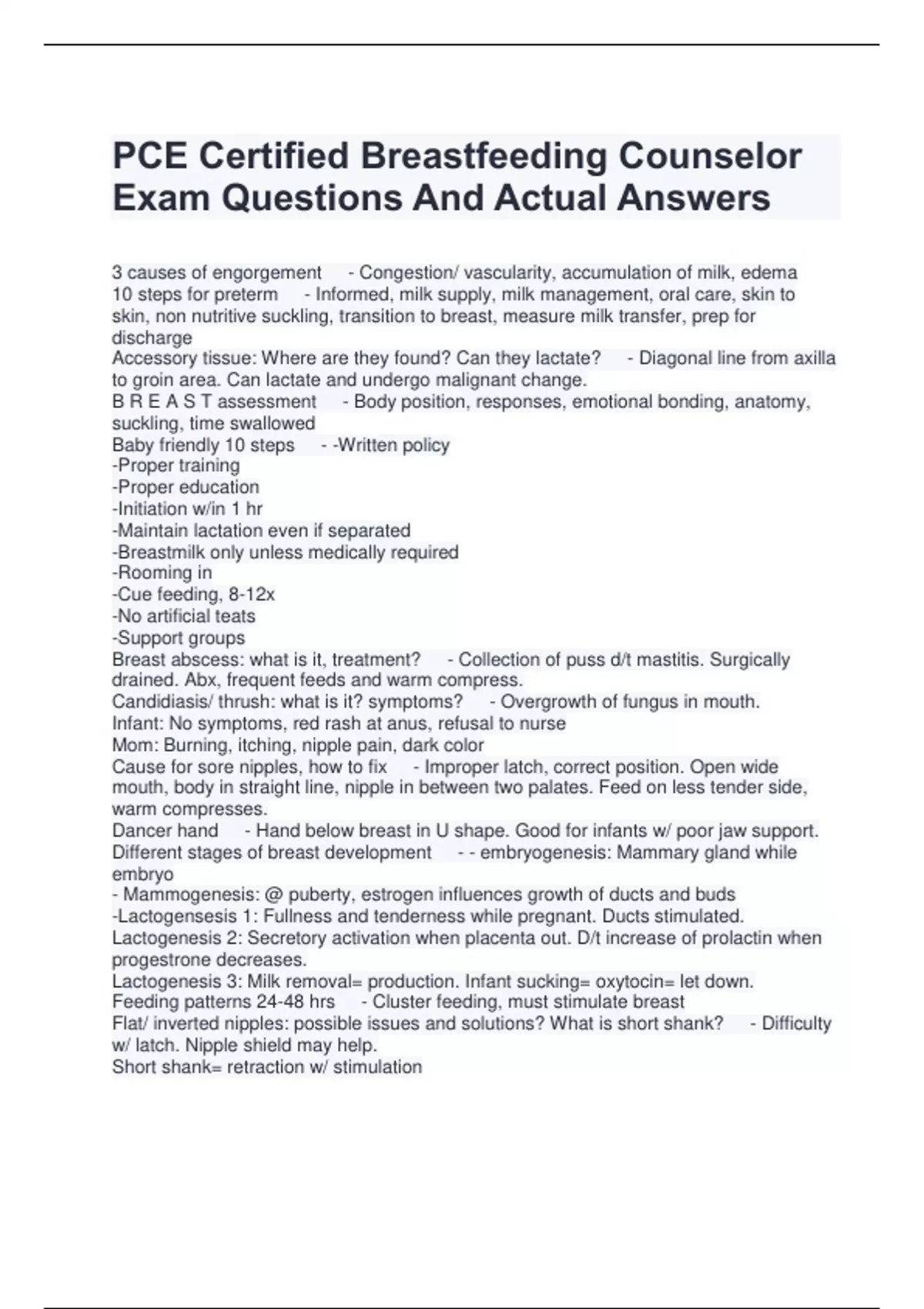 PCE Certified Breastfeeding Counselor Exam Questions And Actual Answers 3 causes of engorgement - Congestion/ vascularity, accumulation of milk, edema 10 steps for preterm - Informed, milk supply, milk management, oral care, skin to skin, non nutritive suckling, transition to breast, measure milk transfer, prep for discharge Accessory tissue: Where are they found? Can they lactate? - Diagonal line from axilla to groin area. Can lactate and undergo malignant change. B R E A S T assessment - Body position, responses, emotional bonding, anatomy, suckling, time swallowed Baby friendly 10 steps - -Written policy -Proper training -Proper education -Initiation w/in 1 hr -Maintain lactation even if separated -Breastmilk only unless medically required -Rooming in -Cue feeding, 8-12x -No artificial teats -Support groups Breast abscess: what is it, treatment? - Collection of puss d/t mastitis. Surgically drained. Abx, frequent feeds and warm compress. Candidiasis/ thrush: what is it? symptoms? - Overgrowth of fungus in mouth. Infant: No symptoms, red rash at anus, refusal to nurse Mom: Burning, itching, nipple pain, dark color Cause for sore nipples, how to fix - Improper latch, correct position. Open wide mouth, body in straight line, nipple in between two palates. Feed on less tender side, warm compresses. Dancer hand - Hand below breast in U shape. Good for infants w/ poor jaw support. Different stages of breast development - - embryogenesis: Mammary gland while embryo - Mammogenesis: @ puberty, estrogen influences growth of ducts and buds -Lactogensesis 1: Fullness and tenderness while pregnant. Ducts stimulated. Lactogenesis 2: Secretory activation when placenta out. D/t increase of prolactin when progestrone decreases. Lactogenesis 3: Milk removal= production. Infant sucking= oxytocin= let down. Feeding patterns 24-48 hrs - Cluster feeding, must stimulate breast Flat/ inverted nipples: possible issues and solutions? What is short shank? - Difficulty w/ latch. Nipple shield may help. Short shank= retraction w/ stimulation How does cleft lip/ palate affect breast feeding? - Unable to seal oral cavity/ generate suction. How does poop transform? - Black to green to yellow (by end of first week). Watery and seedy at first How is milk ejected into ducts from alveoli? aka let down - Myoepitheal cells encase the aveoli, contract in response to oxytocin. In response to sucking oxytocin increases How is preterm milk different? - Higher in protein and immune factors How long after cessation of breast feeding does milk production stop? - 40 days How many calories should a lactating mom intake? - . 500 for milk production. How much vitamin D does a baby need? When to supplement - 400/day. Supplement if mom is deficient. How to induce lactation? - Estrogen and progesterone w/ dopamine antagonist. Nipple stimulation for 2 months. How to treat cleft lip/ palate? - Cup, spoon, bottle prn. Monitor hydration/ wt gain. Cross cradle, elevated football, dancer. Semi upright. How to treat engorgement? - -Alt which breast offered first, completely empty breast, reverse pressure softening, compress areola for latch. No pumping. Supportive bra, gentle massage, green cabbage. RICE: rest, ice, ocmpression (bra), elevate