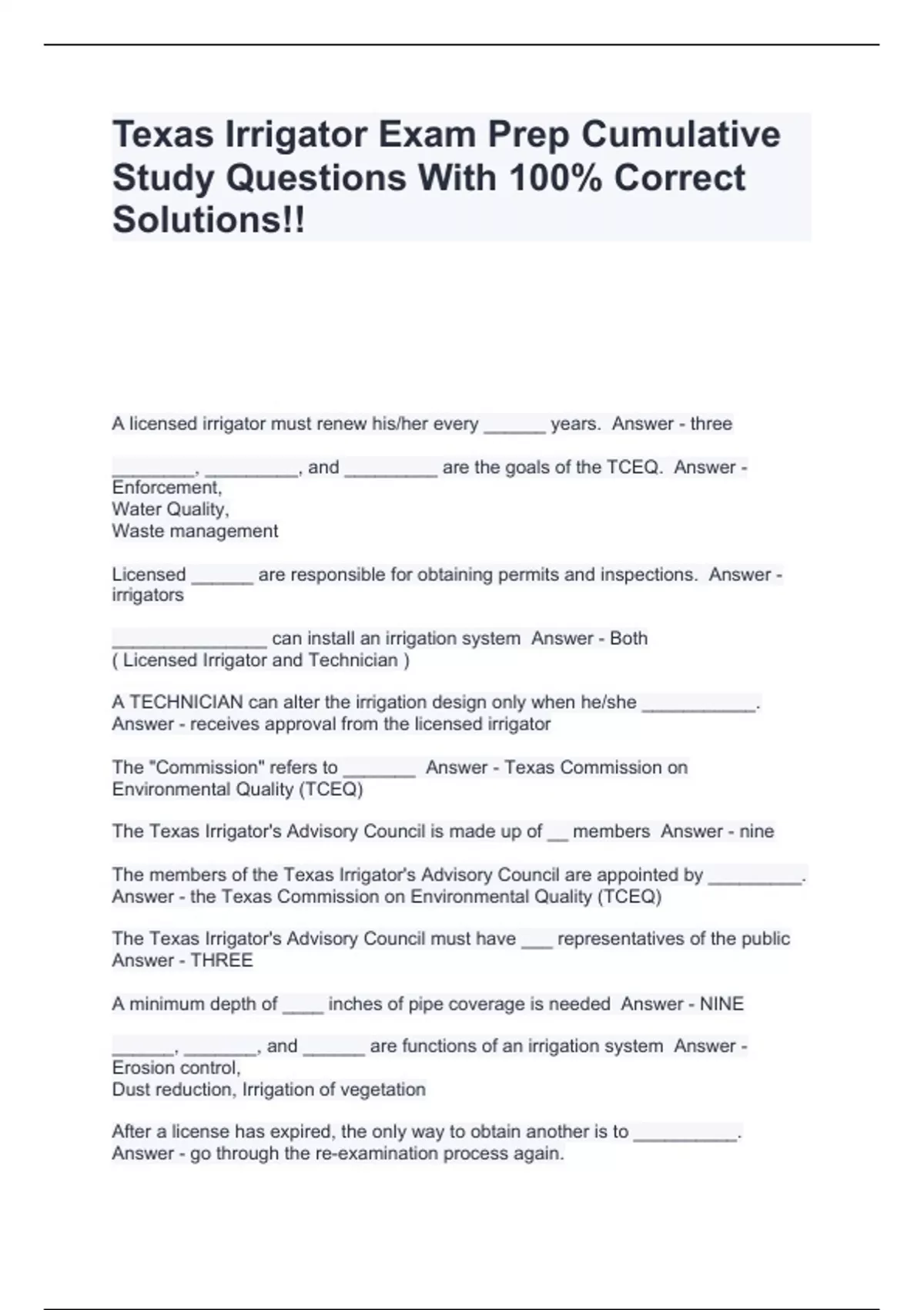 Texas Irrigator Exam Prep Cumulative Study Questions With 100% Correct Solutions!!