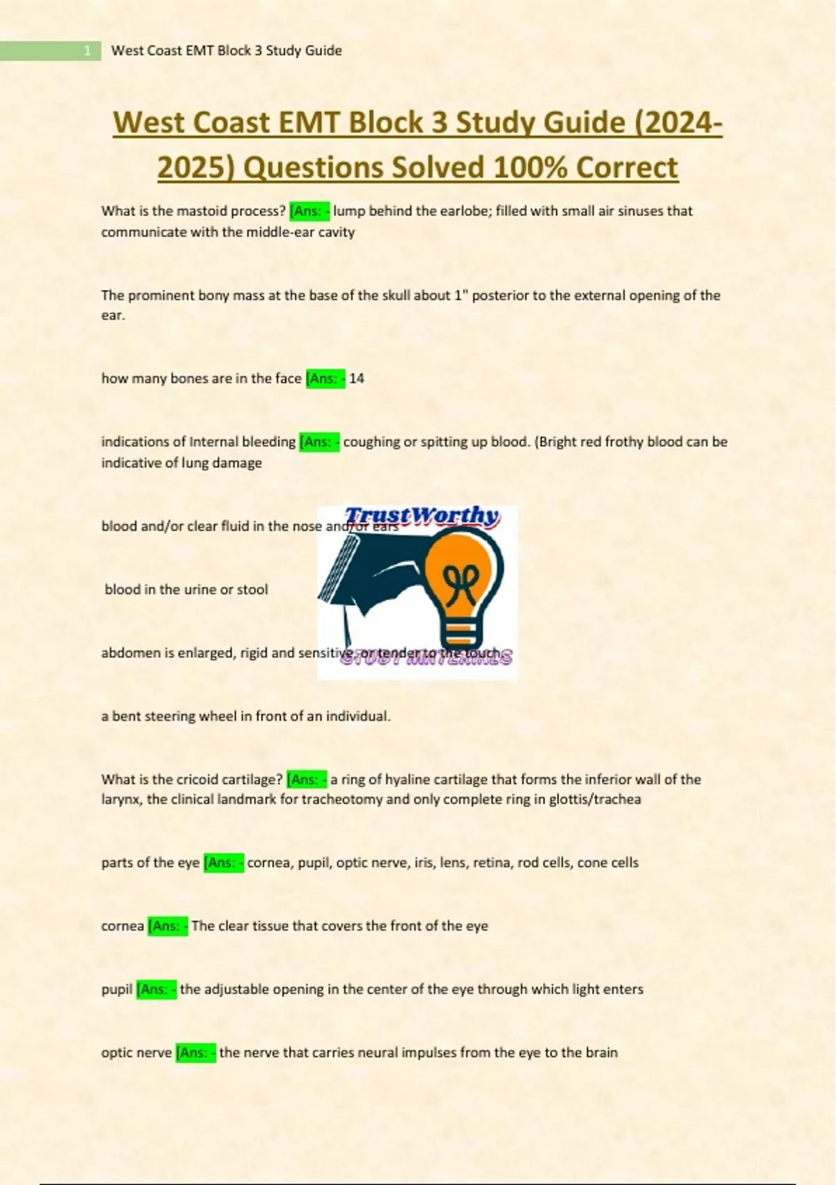 West Coast EMT Block 3 Study Guide () Questions Solved 100% Correct,West Coast EMT Block 3 Study Guide () Questions Solved 100% Correct,West Coast EMT Block 3 Study Guide () Questions Solved 100% Correct