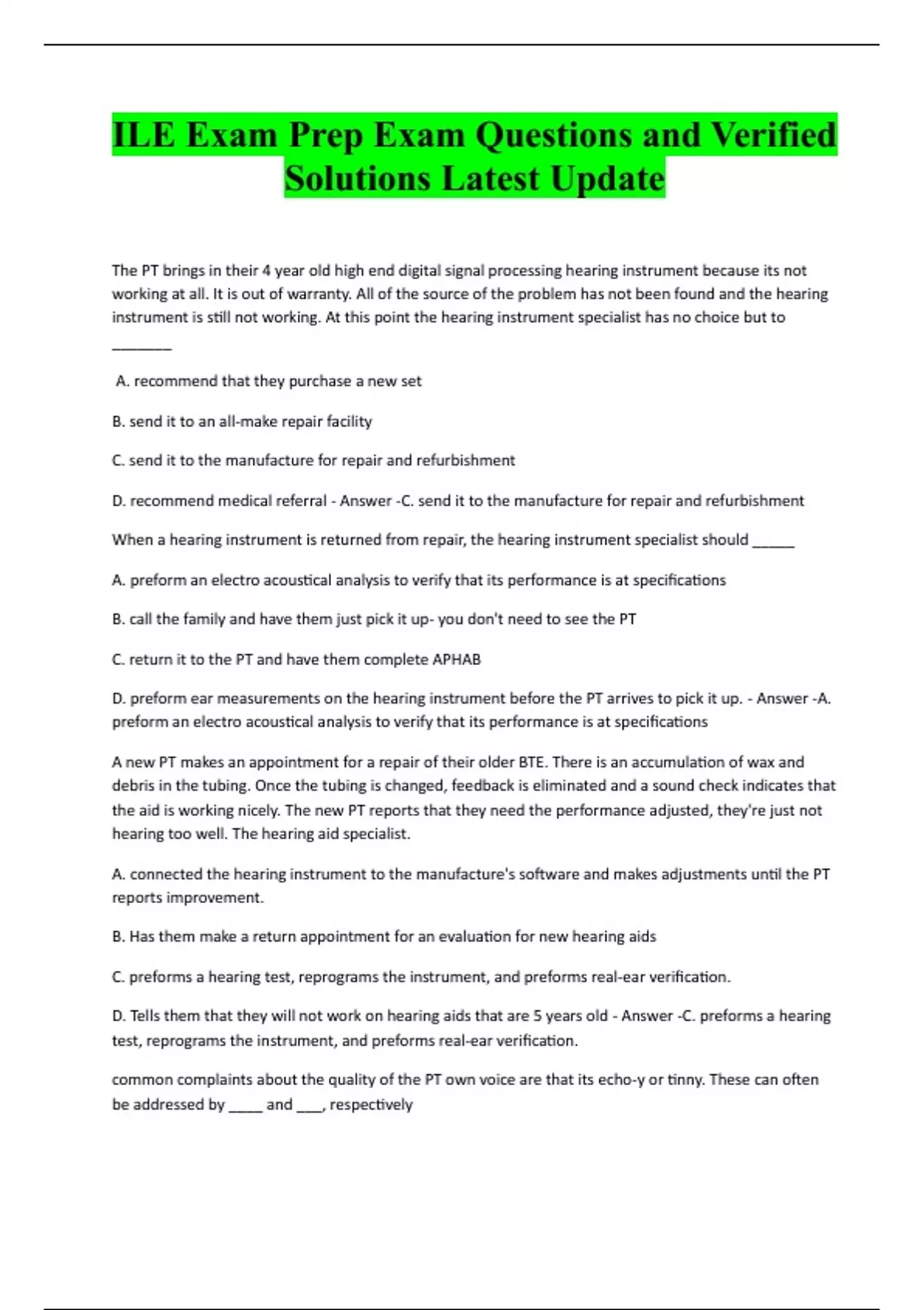 ILE Exam Prep Exam Questions and Verified Solutions Latest Update The PT brings in their 4 year old high end digital signal processing hearing instrument because its not working at all. It is out of warranty. All of the source of the problem has not been found and the hearing instrument is still not working. At this point the hearing instrument specialist has no choice but to _______ A. recommend that they purchase a new set B. send it to an all-make repair facility C. send it to the manufacture for repair and refurbishment D. recommend medical referral - Answer -C. send it to the manufacture for repair and refurbishment When a hearing instrument is returned from repair, the hearing instrument specialist should _____ A. preform an electro acoustical analysis to verify that its performance is at specifications B. call the family and have them just pick it up- you don't need to see the PT C. return it to the PT and have them complete APHAB D. preform ear measurements on the hearing instrument before the PT arrives to pick it up. - Answer -A. preform an electro acoustical analysis to verify that its performance is at specifications A new PT makes an appointment for a repair of their older BTE. There is an accumulation of wax and debris in the tubing. Once the tubing is changed, feedback is eliminated and a sound check indicates that the aid is working nicely. The new PT reports that they need the performance adjusted, they're just not hearing too well. The hearing aid specialist. A. connected the hearing instrument to the manufacture's software and makes adjustments until the PT reports improvement. B. Has them make a return appointment for an evaluation for new hearing aids C. preforms a hearing test, reprograms the instrument, and preforms real-ear verification. D. Tells them that they will not work on hearing aids that are 5 years old - Answer -C. preforms a hearing test, reprograms the instrument, and preforms real-ear verification. common complaints about the quality of the PT own voice are that its echo-y or tinny. These can often be addressed by ____ and ___, respectivelyA. increasing the low frequency gain, increasing the high frequency gain B. decreasing the low frequency gain, increasing the high frequency gain C. increasing the low frequency gain, decreasing the high frequency gain D. decreasing the low frequency gain, decreasing the high frequency gain. - Answer -D. decreasing the low frequency gain, decreasing the high frequency gain. Feedback can be from ____ A. a bad batt