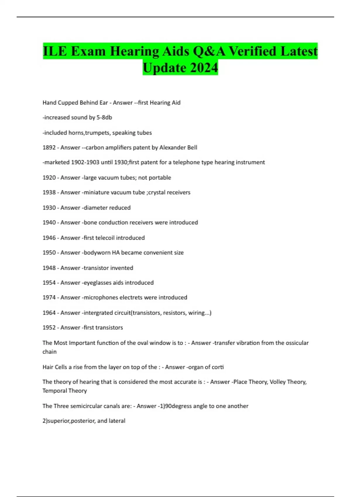 ILE Exam Hearing Aids Q&A Verified Latest Update 2024 Hand Cupped Behind Ear - Answer --first Hearing Aid -increased sound by 5-8db -included horns,trumpets, speaking tubes 1892 - Answer --carbon amplifiers patent by Alexander Bell -marketed until 1930;first patent for a telephone type hearing instrument 1920 - Answer -large vacuum tubes; not portable 1938 - Answer -miniature vacuum tube ;crystal receivers 1930 - Answer -diameter reduced 1940 - Answer -bone conduction receivers were introduced 1946 - Answer -first telecoil introduced 1950 - Answer -bodyworn HA became convenient size 1948 - Answer -transistor invented 1954 - Answer -eyeglasses aids introduced 1974 - Answer -microphones electrets were introduced 1964 - Answer -intergrated circuit(transistors, resistors, wiring...) 1952 - Answer -first transistors The Most Important function of the oval window is to : - Answ
