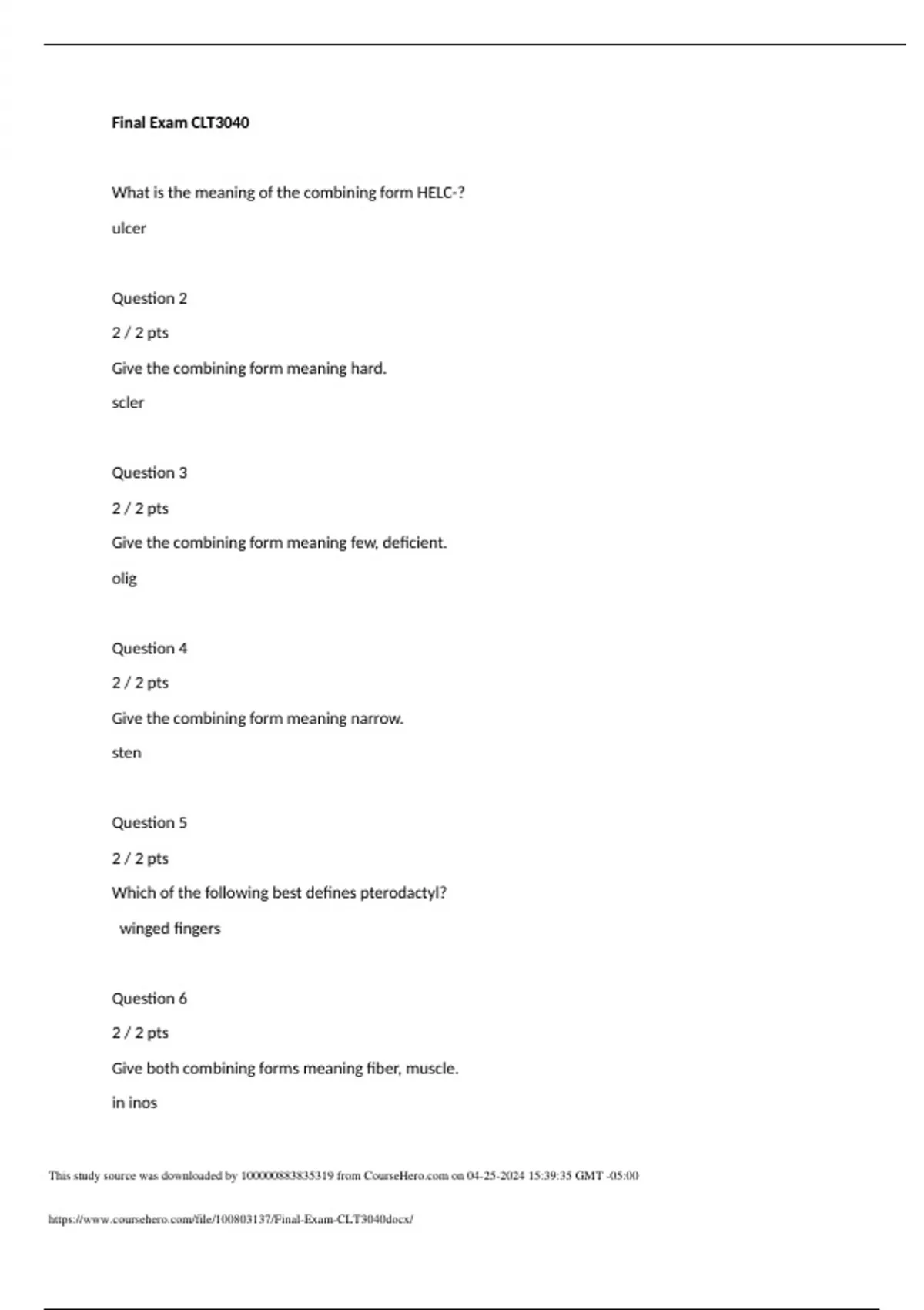 Final Exam CLT3040 QUESTION AND ANSWERS 100% CORRECT