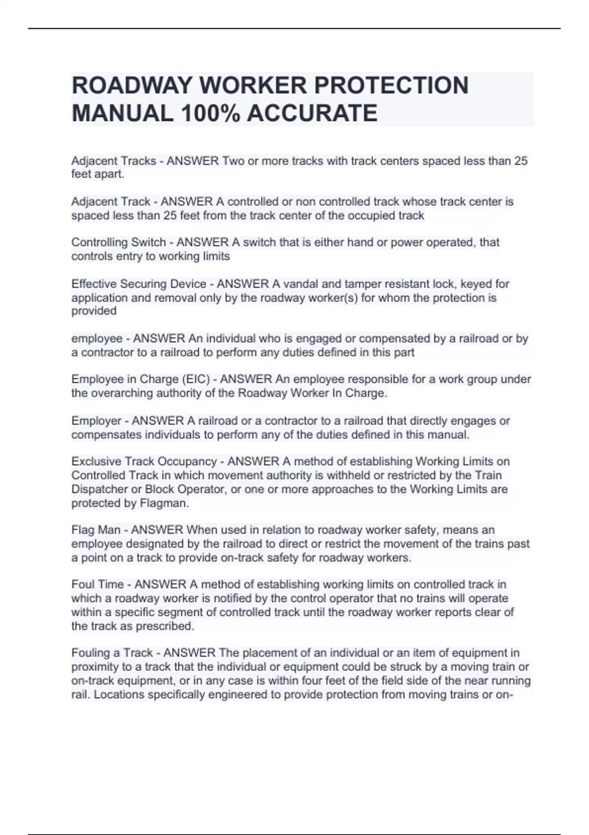 ROADWAY WORKER PROTECTION MANUAL 100% ACCURATE
