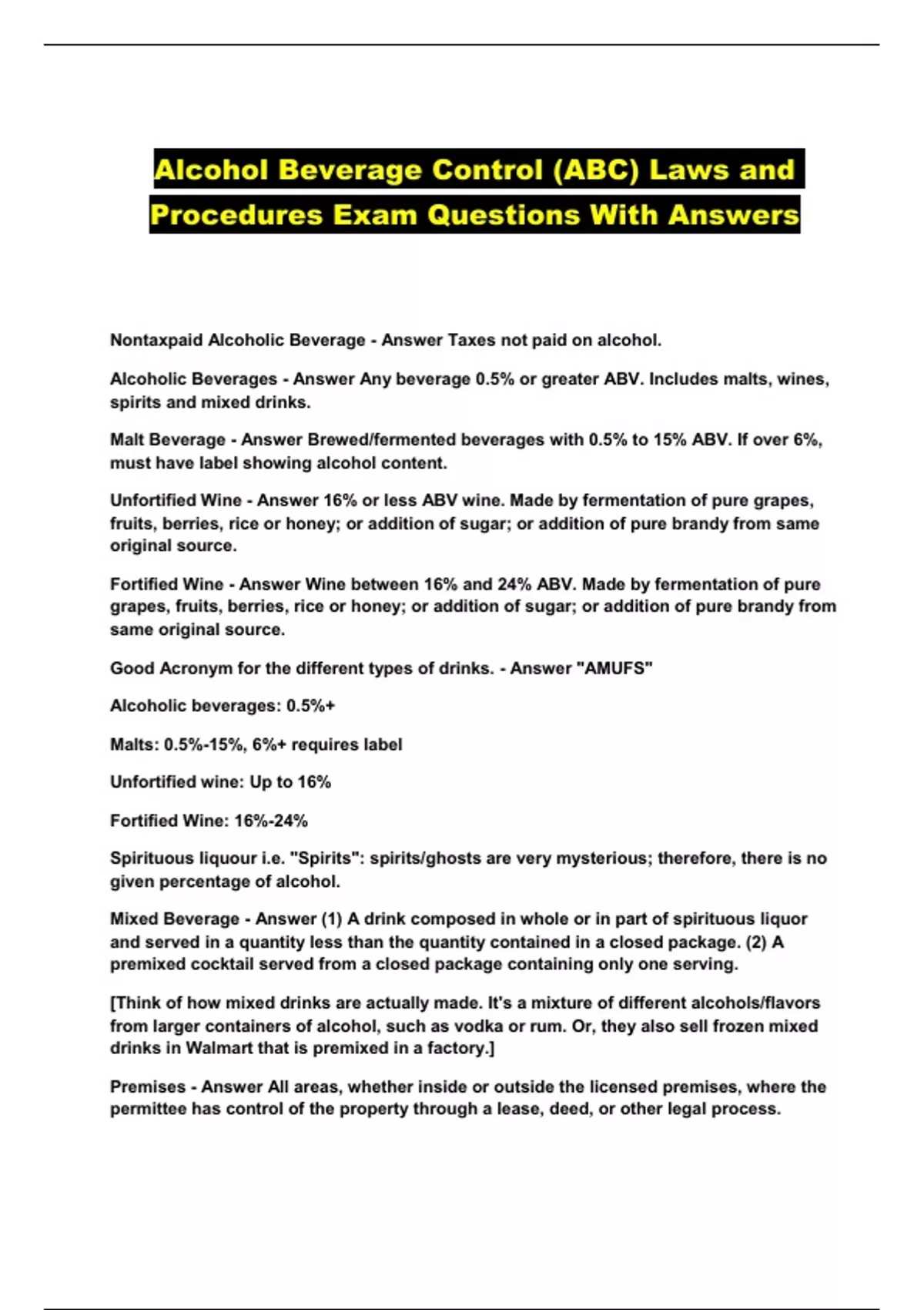 Alcohol Beverage Control (ABC) Laws and Procedures Exam Questions With Answers...
