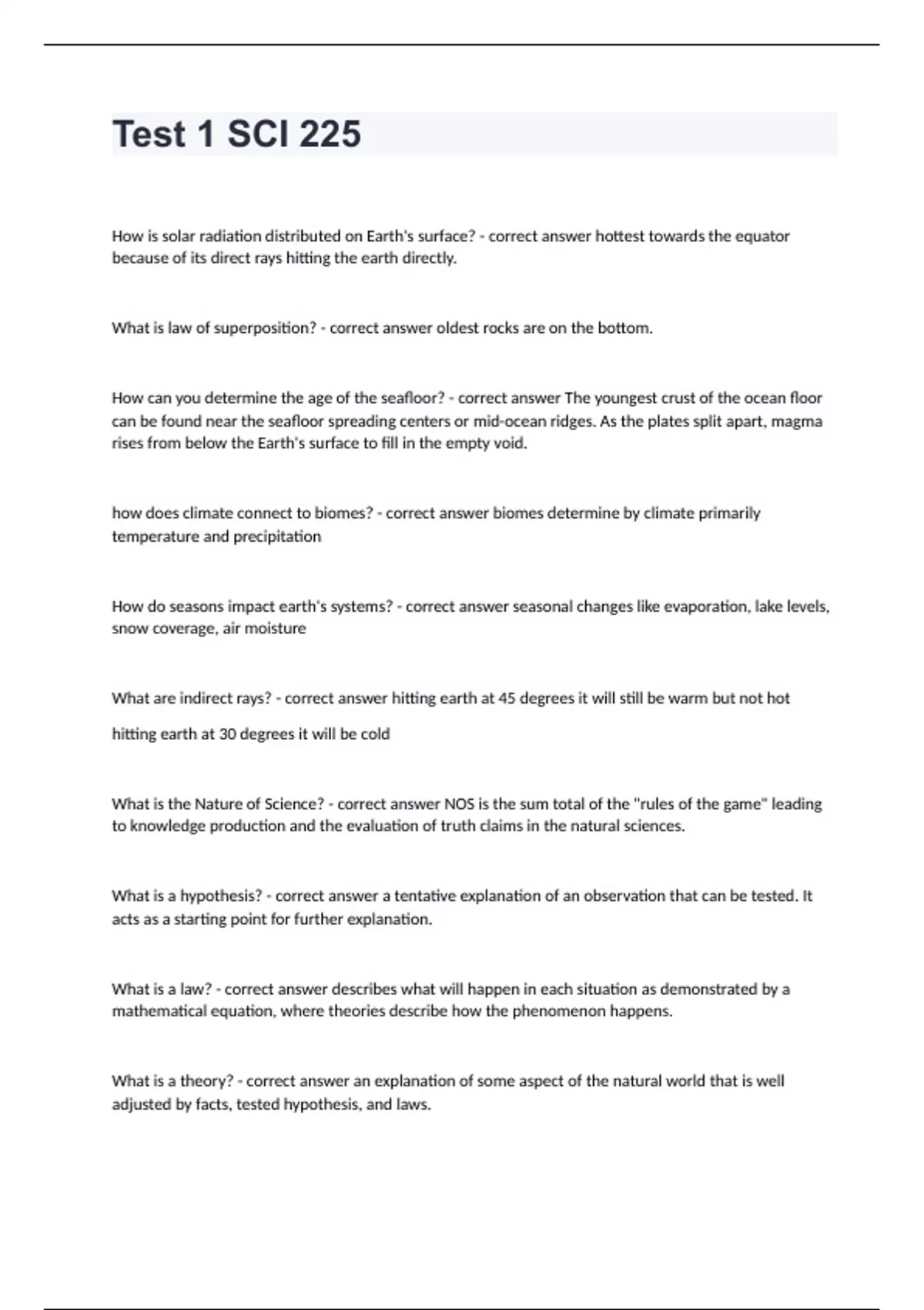 Test 1 SCI 225How is solar radiation distributed on Earth's surface? - correct answer hottest towards the equator because of its direct rays hitting the earth directly. What is law of superposition? - correct answer oldest rocks are on the bottom. How can you determine the age of the seafloor? - correct answer The youngest crust of the ocean floor can be found near the seafloor spreading centers or mid-ocean ridges. As the plates split apart, magma rises from below the Earth's surface to fill in the empty void. how does climate connect to biomes? - correct answer biomes determine by climate primarily temperature and precipitation How do seasons impact earth's systems? - correct answer seasonal changes like evaporation, lake levels, snow coverage, air moisture What are indirect rays? - correct answer hitting earth at 45 degrees it will still be warm but not hot hitting earth at 30 degrees it will be cold What is the Nature of Science? - correct answer NOS is the sum total of the "rules of the game" leading to knowledge production and the evaluation of truth claims in the natural sciences. What is a hypothesis? - correct answer a tentative explanation of an observation that can be tested. It acts as a starting point for further explanation. What is a law? - correct answer describes what will happen in each situation as demonstrated by a mathematical equation, where theories describe how the phenomenon happens.