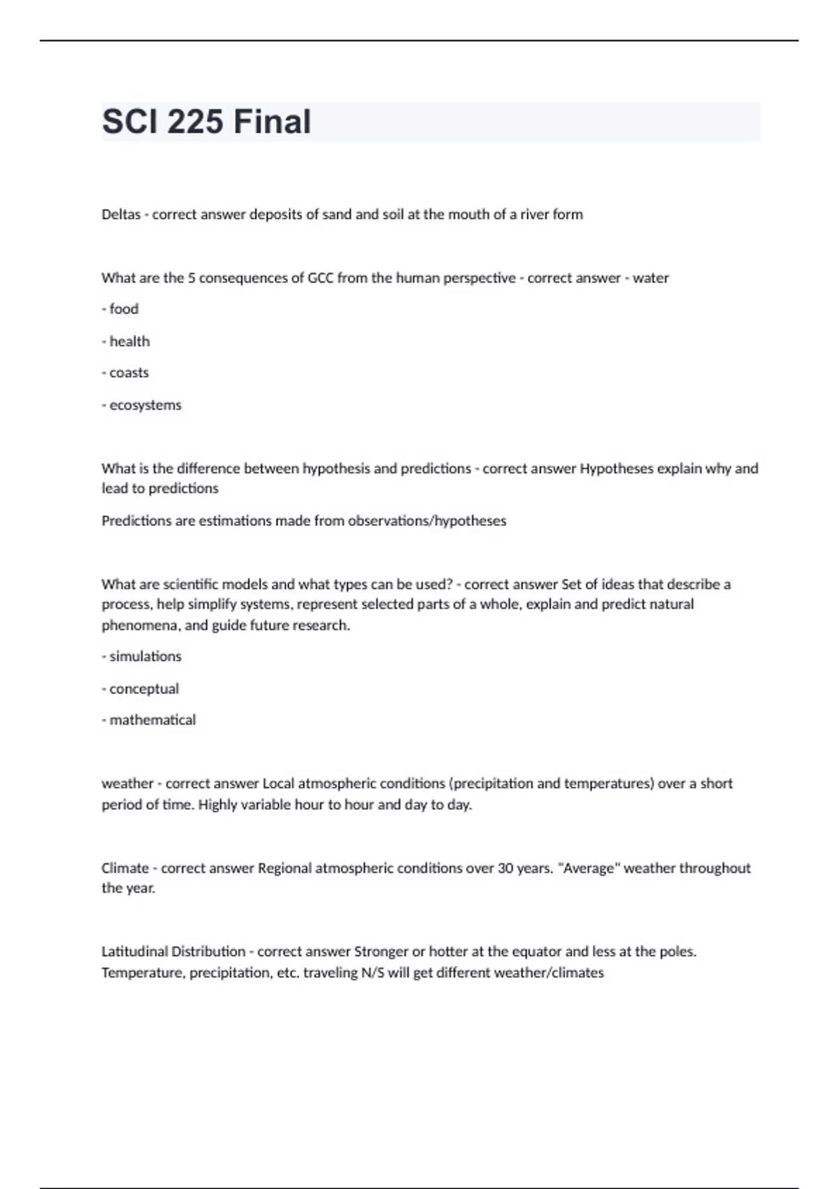 SCI 225 FinalDeltas - correct answer deposits of sand and soil at the mouth of a river form What are the 5 consequences of GCC from the human perspective - correct answer - water - food - health - coasts - ecosystems What is the difference between hypothesis and predictions - correct answer Hypotheses explain why and lead to predictions Predictions are estimations made from observations/hypotheses What are scientific models and what types can be used? - correct answer Set of ideas that describe a process, help simplify systems, represent selected parts of a whole, explain and predict natural phenomena, and guide future research. - simulations - conceptual - mathematical weather - correct answer Local atmospheric conditions (precipitation and temperatures) over a short period of time. Highly variable hour to hour and day to day. Climate - correct answer Regional atmospheric conditions over 30 years. "Average" weather throughout the year. Latitudinal Distribution - correct answer Stronger or hotter at the equator and less at the poles. Temperature, precipitation, etc. traveling N/S will get different weather/climates