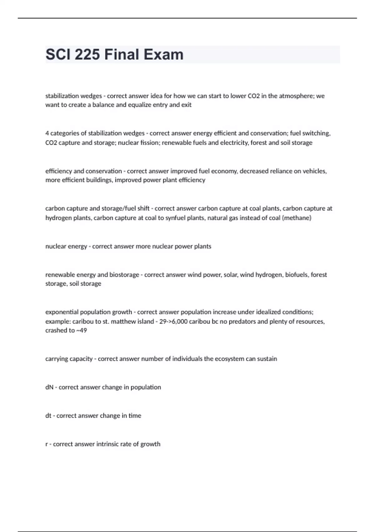 SCI 225 Final Examstabilization wedges - correct answer idea for how we can start to lower CO2 in the atmosphere; we want to create a balance and equalize entry and exit 4 categories of stabilization wedges - correct answer energy efficient and conservation; fuel switching, CO2 capture and storage; nuclear fission; renewable fuels and electricity, forest and soil storage efficiency and conservation - correct answer improved fuel economy, decreased reliance on vehicles, more efficient buildings, improved power plant efficiency carbon capture and storage/fuel shift - correct answer carbon capture at coal plants, carbon capture at hydrogen plants, carbon capture at coal to synfuel plants, natural gas instead of coal (methane) nuclear energy - correct answer more nuclear power plants renewable energy and biostorage - correct answer wind power, solar, wind hydrogen, biofuels, forest storage, soil storage exponential population growth - correct answer population increase under idealized conditions; example: caribou to st. matthew island - 29->6,000 caribou bc no predators and plenty of resources, crashed to ~49 carrying capacity - correct answer number of individuals the ecosystem can sustain dN - correct answer change in population dt - correct answer change in time r - correct answer intrinsic rate of growth