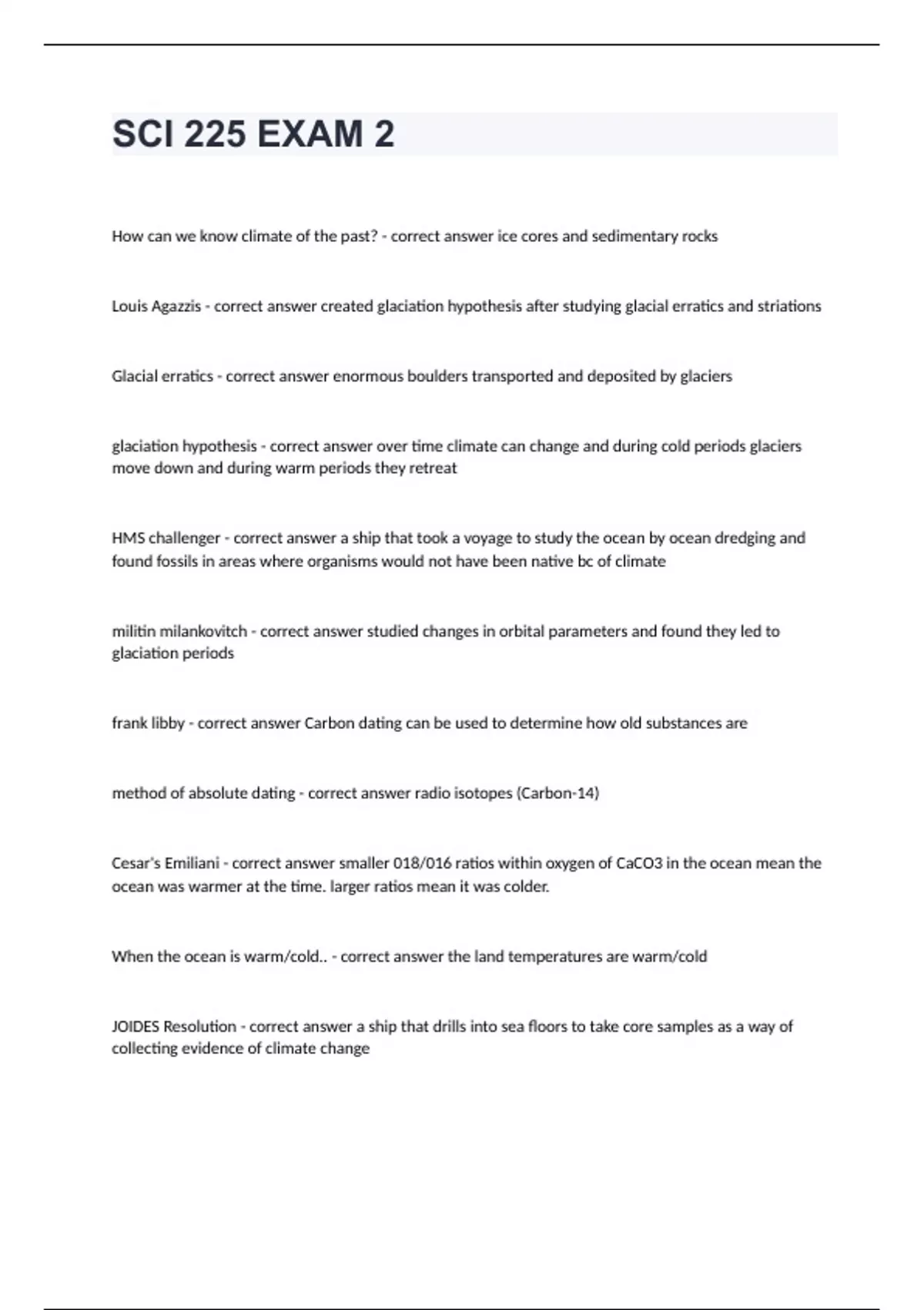 SCI 225 EXAM 2 How can we know climate of the past? - correct answer ice cores and sedimentary rocks Louis Agazzis - correct answer created glaciation hypothesis after studying glacial erratics and striations Glacial erratics - correct answer enormous boulders transported and deposited by glaciers glaciation hypothesis - correct answer over time climate can change and during cold periods glaciers move down and during warm periods they retreat HMS challenger - correct answer a ship that took a voyage to study the ocean by ocean dredging and found fossils in areas where organisms would not have been native bc of climate militin milankovitch - correct answer studied changes in orbital parameters and found they led to glaciation periods frank libby - correct answer Carbon dating can be used to determine how old substances are method of absolute dating - correct answer radio isotopes (Carbon-14) Cesar's Emiliani - correct answer smaller 018/016 ratios within oxygen of CaCO3 in the ocean mean the ocean was warmer at the time. larger ratios mean it was colder. When the ocean is warm/cold.. - correct answer the land temperatures are warm/cold JOIDES Resolution - correct answer a ship that drills into sea floors to take core samples as a way of collecting evidence of climate change