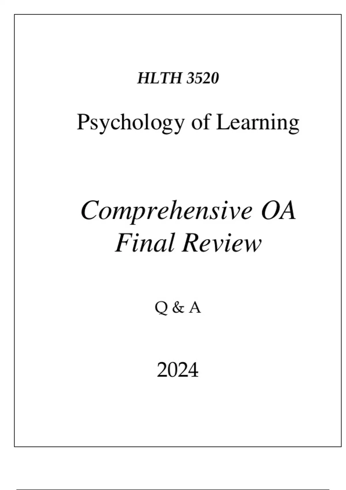 (WGU D566) HLTH 3520 PSYCHOLOGY OF LEARNING COMPREHENSIVE OA FINAL REVIEW 2024(WGU D566) HLTH 3520 PSYCHOLOGY OF LEARNING COMPREHENSIVE OA FINAL REVI(WGU D566) HLTH 3520 PSYCHOLOGY OF LEARNING COMPREHENSIVE OA FINAL REVIEW 2024EW 2024(WGU D566) HLTH 3520 PSYCHOLOGY OF LEARNING COMPREHENSIVE OA FINAL REVIEW 2024