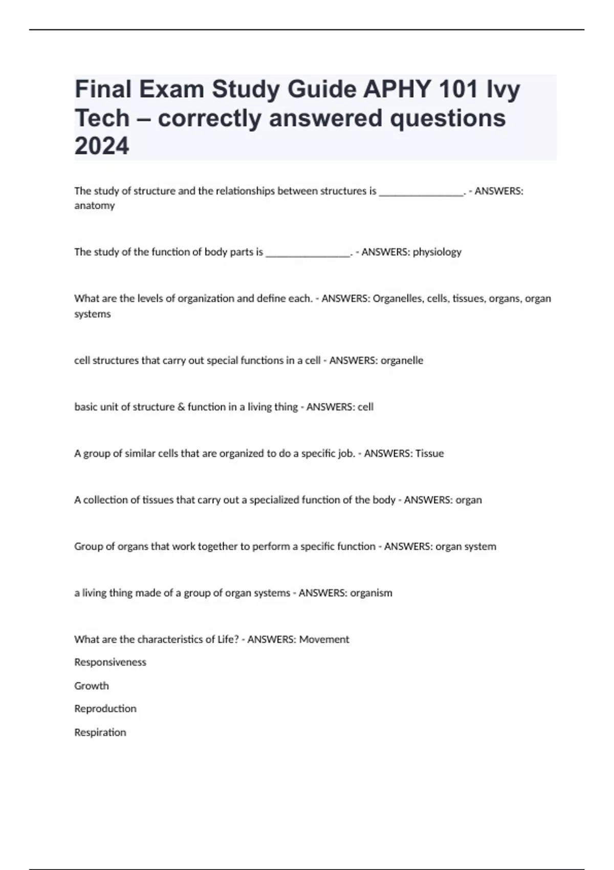 Final Exam Study Guide APHY 101 Ivy Tech – correctly answered questions 2024