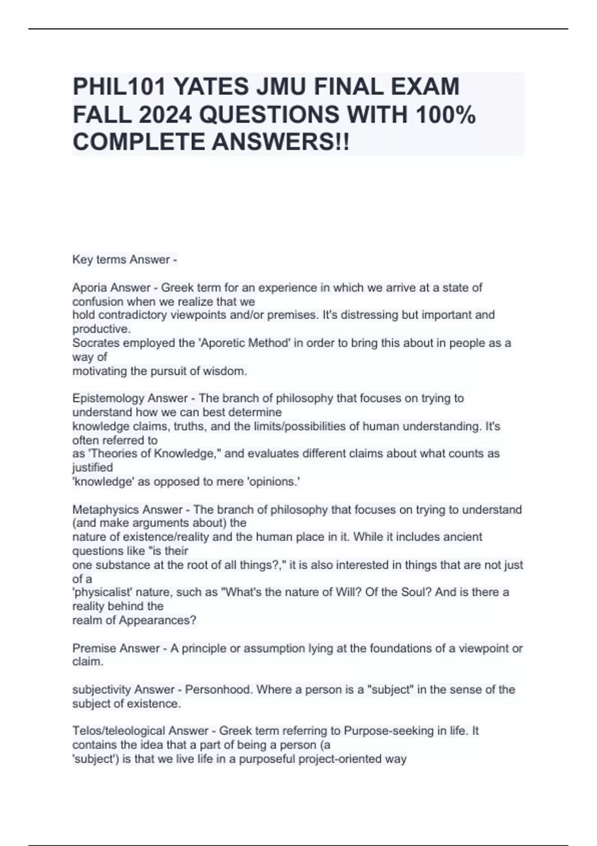 PHIL101 YATES JMU FINAL EXAM FALL 2024 QUESTIONS WITH 100% COMPLETE ANSWERS!!