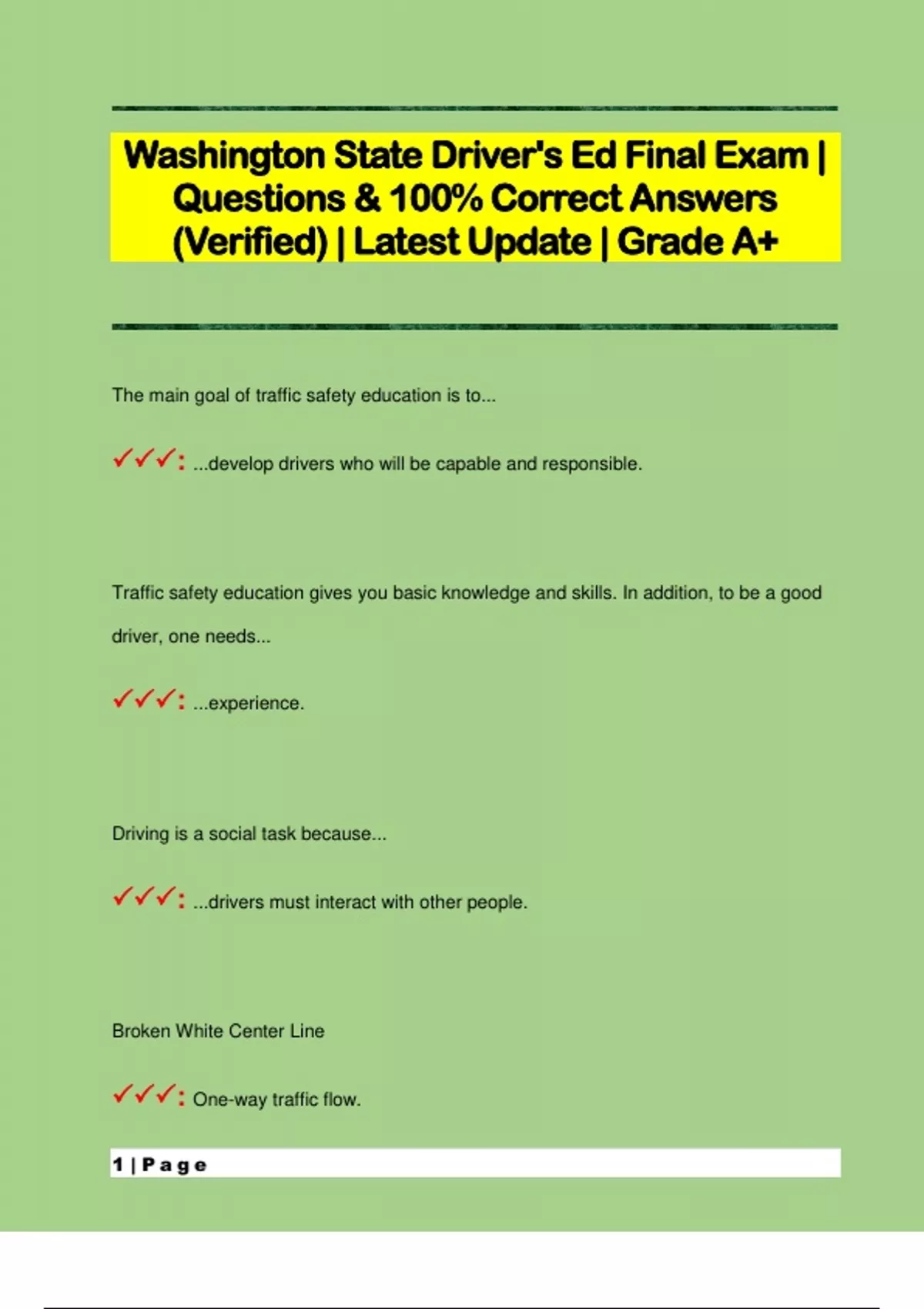 Washington State Driver's Ed Final Exam | Questions & 100% Correct Answers (Verified) | Latest Update | Grade A+