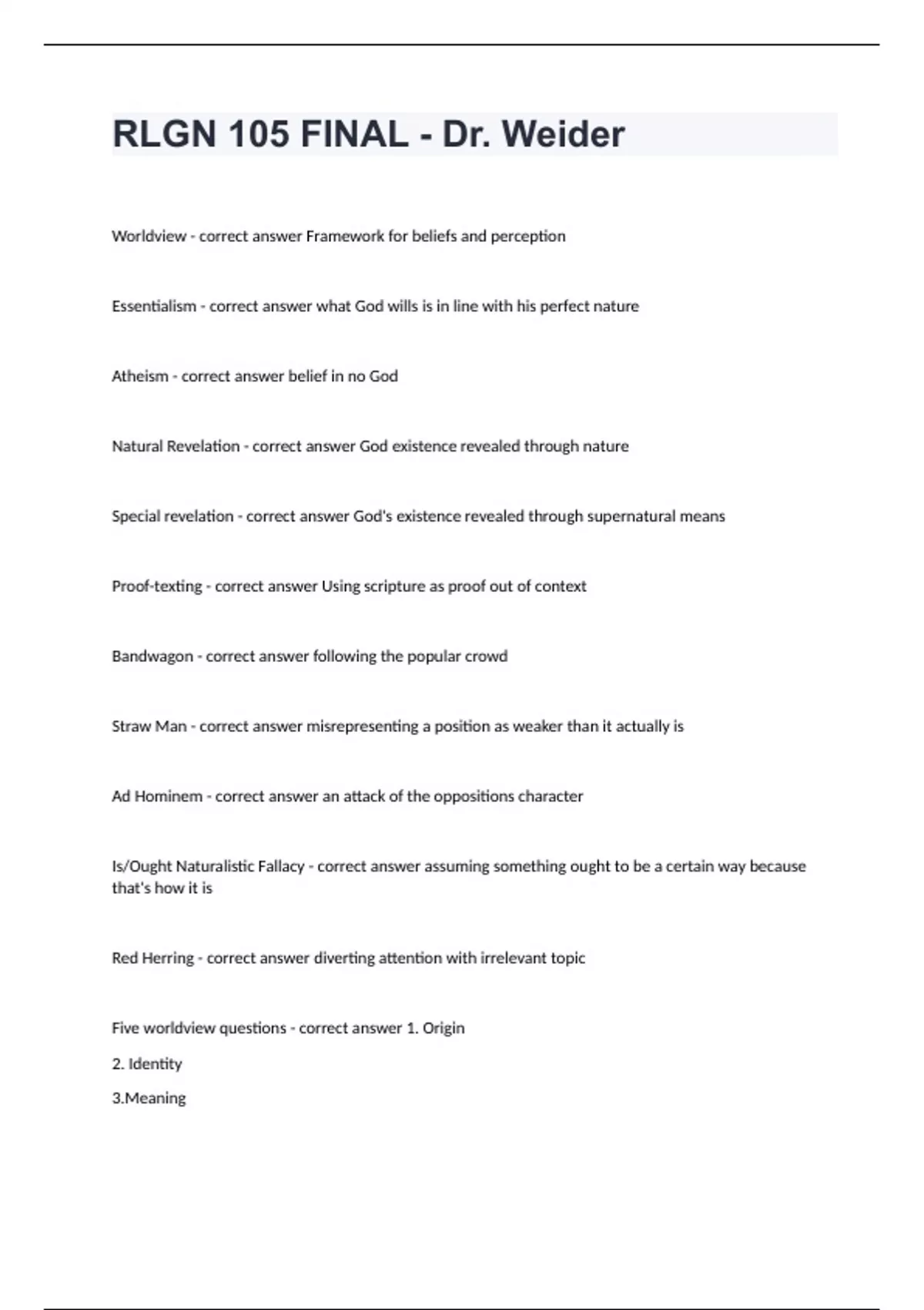 RLGN 105 FINAL - Dr. Weider Questions with complete solution 2024 RLGN 105 FINAL - Dr. Weider Worldview - correct answer Framework for beliefs and perception Essentialism - correct answer what God wills is in line with his perfect nature Atheism - correct answer belief in no God Natural Revelation - correct answer God existence revealed through nature Special revelation - correct answer God's existence revealed through supernatural means Proof-texting - correct answer Using scripture as proof out of context Bandwagon - correct answer following the popular crowd Straw Man - correct answer misrepresenting a position as weaker than it actually is Ad Hominem - correct answer an attack of the oppositions character Is/Ought Naturalistic Fallacy - correct answer assuming something ought to be a certain way because that's how it is