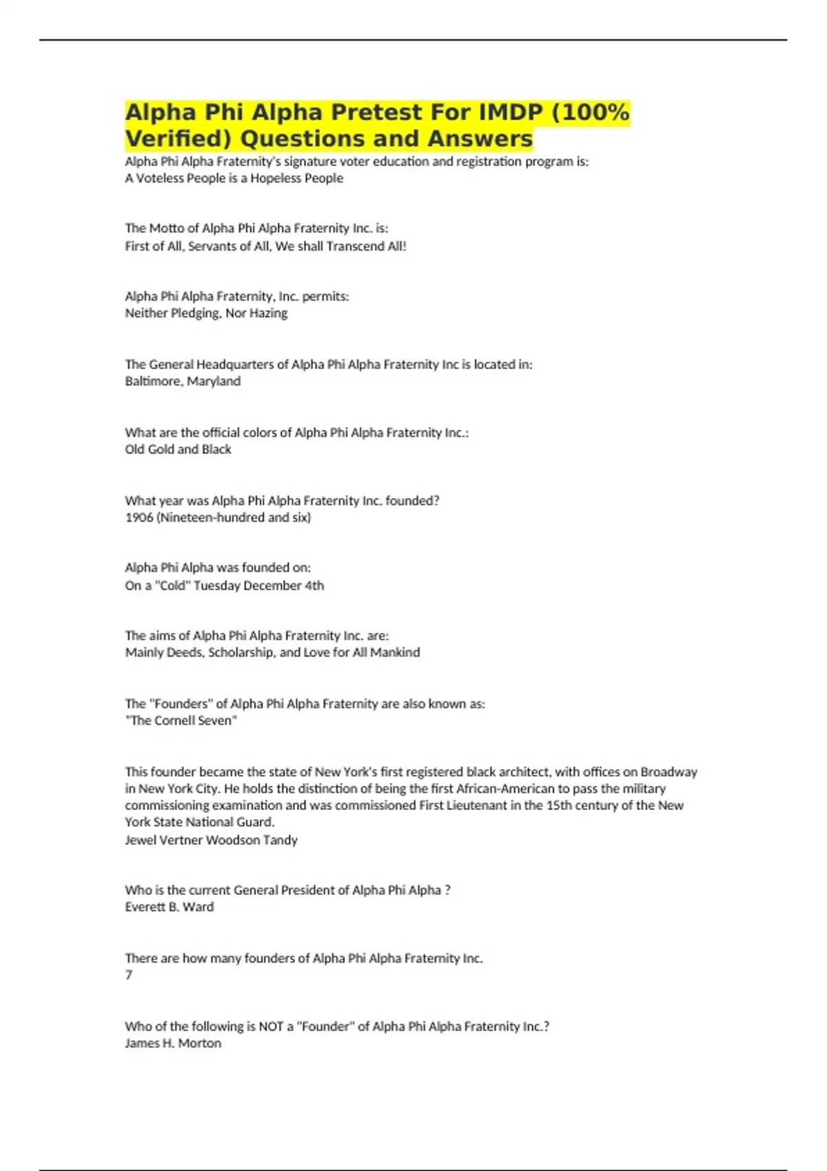 Alpha Phi Alpha Pretest For IMDP (100% Verified) Questions and Answers Alpha Phi Alpha Fraternity's signature voter education and registration program is: A Voteless People is a Hopeless People The Motto of Alpha Phi Alpha Fraternity Inc. is: First of All, Servants of All, We shall Transcend All! Alpha Phi Alpha Fraternity, Inc. permits: Neither Pledging, Nor Hazing The General Headquarters of Alpha Phi Alpha Fraternity Inc is located in: Baltimore, Maryland What are the official colors of Alpha Phi Alpha Fraternity Inc.: Old Gold and Black What year was Alpha Phi Alpha Fraternity Inc. founded? 1906 (Nineteen-hundred and six) Alpha Phi Alpha was founded on: On a "Cold" Tuesday December 4th The aims of Alpha Phi Alpha Fraternity Inc. are: Mainly Deeds, Scholarship, and Love for All Mankind The "Founders" of Alpha Phi Alpha Fraternity are also known as: "The Cornell Seven" This founder became the state of New York's first registered black architect, with offices on Broadway in New York City. He holds the distinction of being the first African-American to pass the military commissioning examination and was commissioned First Lieutenant in the 15th century of the New York State National Guard. Jewel Vertner Woodson Tandy Who is the current General President of Alpha Phi Alpha ? Everett B. Ward There are how many founders of Alpha Phi Alpha Fraternity Inc. 7 Who of the following is NOT a "Founder" of Alpha Phi Alpha Fraternity Inc.? James H. Morton