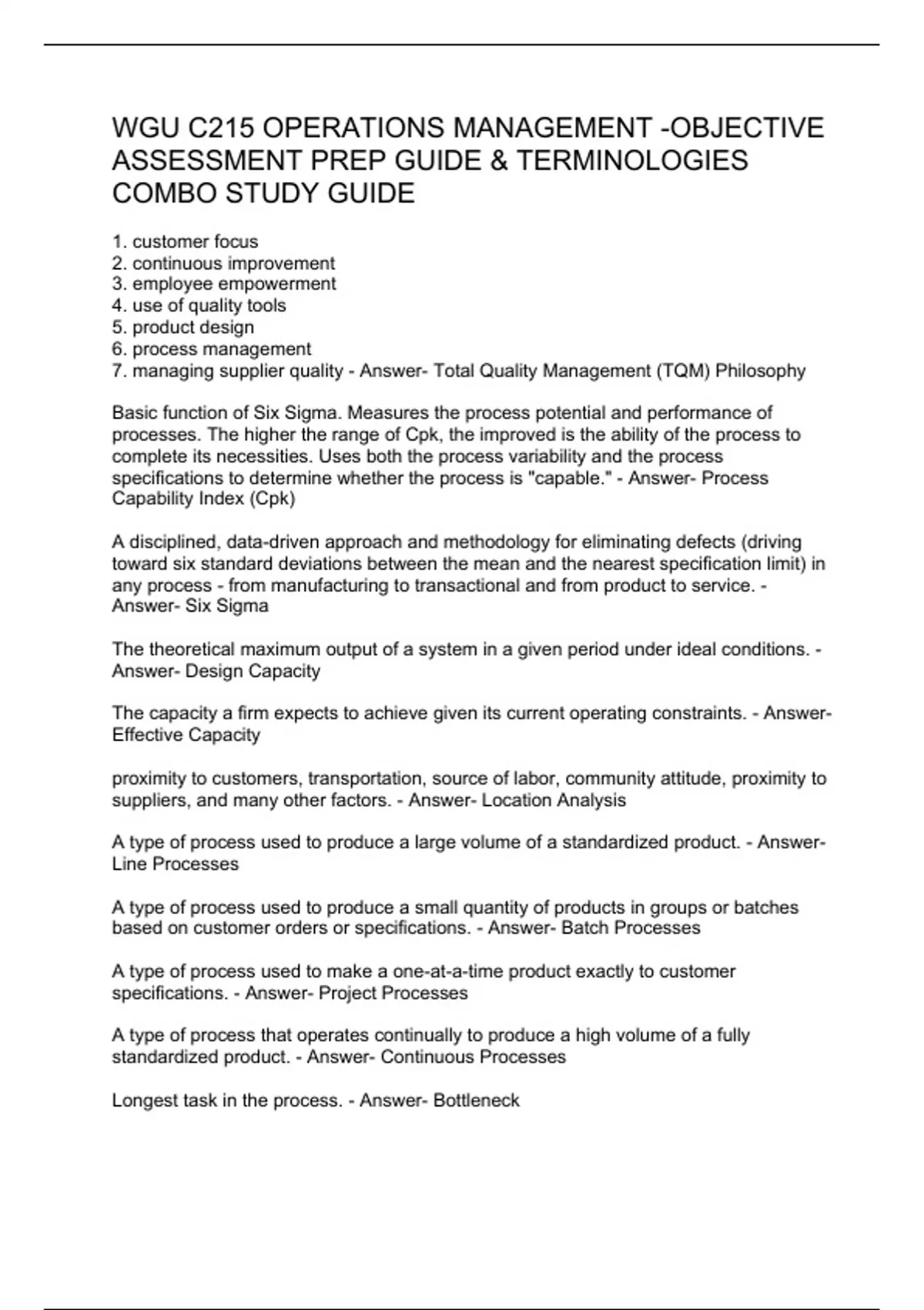 WGU C215 OPERATIONS MANAGEMENT -OBJECTIVE ASSESSMENT PREP GUIDE & TERMINOLOGIES COMBO STUDY GUIDE