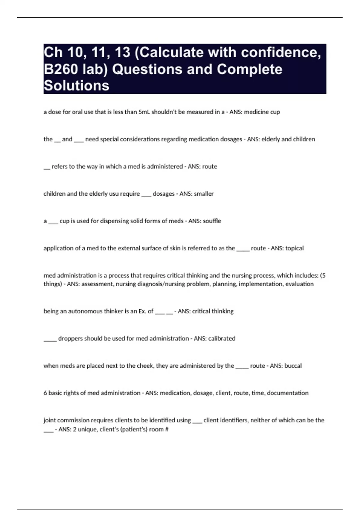 Ch 10, 11, 13 (Calculate with confidence, B260 lab) Questions and Complete Solutions.