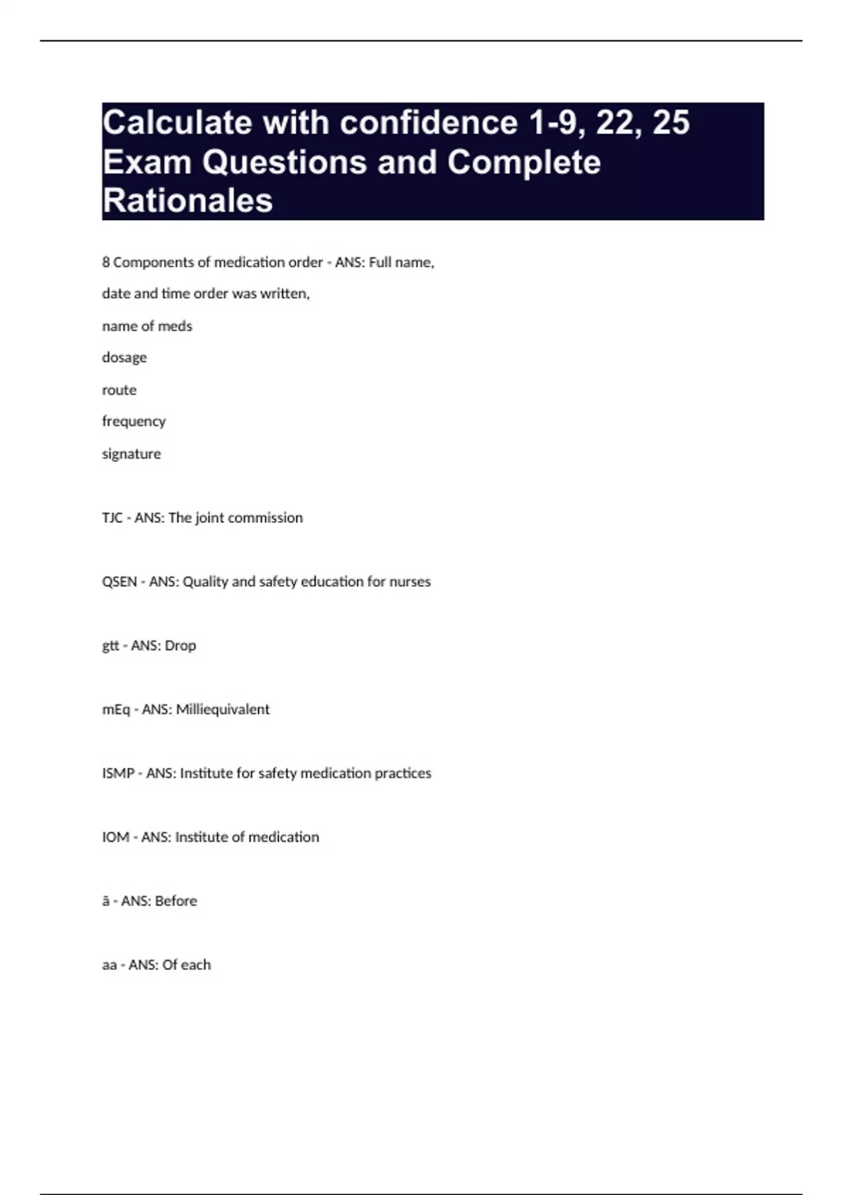 Calculate with confidence 1-9, 22, 25 Exam Questions and Complete Rationales.