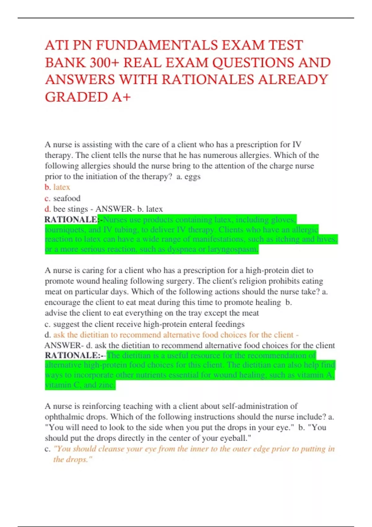 ATI PN FUNDAMENTALS EXAM TEST BANK 300+ REAL EXAM QUESTIONS AND ANSWERS WITH RATIONALES ALREADY GRADED A+