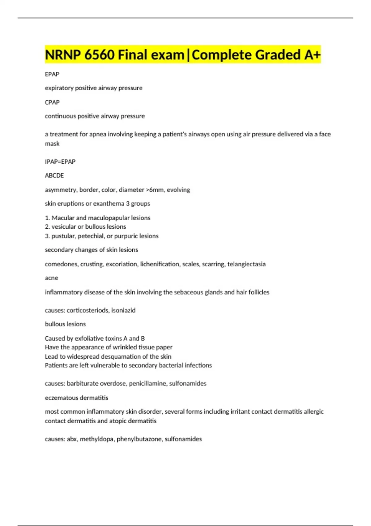 NRNP 6560 Final exam|Complete Graded A+ EPAP expiratory positive airway pressure CPAP continuous positive airway pressure a treatment for apnea involving keeping a patient's airways open using air pressure delivered via a face mask IPAP=EPAP ABCDE asymmetry, border, color, diameter 6mm, evolving skin eruptions or exanthema 3 groups 1. Macular and maculopapular lesions 2. vesicular or bullous lesions 3. pustular, petechial, or purpuric lesions secondary changes of skin lesions comedones, crusting, excoriation, lichenification, scales, scarring, telangiectasia acne inflammatory disease of the skin involving the sebaceous glands and hair follicles causes: corticosteriods, isoniazid bullous lesions Caused by exfoliative toxins A and B Have the appearance of wrinkled tissue paper Lead to widespread desquamation of the skin Patients are left vulnerable to secondary bacterial infections causes: barbiturate overdose, penicillamine, sulfonamides eczematous dermatitis most common inflammatory skin disorder, several forms including irritant contact dermatitis allergic contact dermatitis and atopic dermatitis causes: abx, methyldopa, phenylbutazone, sulfonamides erythemia multiforme Hypersensitivity reaction characterized by targetoid rash and bullae; *HSV and mycoplasma infections; EM with oral mucosa and fever is steven-johnson syndrome causes: barbiturates, hydantois, penicillin, salicylates, sulfonamides, sulfonylureas erythema nodosum inflammation of subcutaneous tissues resulting in tender, erythematous nodules; may be an abnormal immune response to a systemic disease, an infection, or a drug causes: contraceptives, sulfonamides exfoliative dermatitis a condition in which there is widespread scaling of the skin, often with pruritus, erythroderma, and hair loss causes: allopurinal, gold, indomethacin, phenylbutazone lichenoid eruption violaceous to purple, polygonal lesions that resemble those seen in lichen planus Causes: cholorquine, chlorpropamide, mepacrine, quinidine, quinine, thiazides photosensitivity increased reaction of the skin to exposure to sunlight causes: amiodarone, nalidixic acid, sulfonamides, tetracycline pigmentation coloration caused by deposit, or lack, of colored material in the tissues causes: chloroquine, heavy metals, mepacrine Psoriasiform rash causes: gold, methyldopa purpura multiple pinpoint hemorrhages and accumulation of blood under the skin causes: cytotoxic drugs, meprobamate, quinidine, quinine systemic lupus erythematosus (SLE) chronic autoimmune inflammatory disease of collagen in skin, joints, and internal organs causes: hydralazine, isoniazid, penicillamine, procainamide urticaria allergic reaction of the skin characterized by the eruption of pale red, elevated patches called wheals or hives causes: aspirin, imipramine, penicillin, serum, toxoid, vaccines Bulla a large blister that is usually more than 0.5 cm in diameter Comedones plug of keratin and sebum wedged in a dilated pilosebaceous crust accumulated dried exudate Excoriation a superficial loss of skin, e.g., by scratching lichenification area of increased epidermal thickening with exaggerated skin markings, caused by constant rubbing (atopic eczema) keloid a sharply elevated, irregularly shaped, progressively enlarging scar due to excessive collagen formation in the dermis during connective tissue macule flat, colored spot on the skin nodule circumscribed, palpable area of the skin that is 0.5 cm in diameter and appears in part or wholly within the dermis papule A circumscribed, solid elevation of skin 1cm in diameter, with no visible fluid patch large macule, 2cm in diameter plaque circumscribed, disk-shaped elevated area of the skin 1cm diameter purpura multiple pinpoint hemorrhages and accumulation of blood under the skin pustule raised spot on the skin containing pus scales flakes or dry patches made up of excess dead epidermal cells scar area of fibrous tissue that replaces the lost epidermis stria streak-like, linear, atrophic, pink, purple, or white lesion caused by stretching of the skin Telangiectasia skin lesion due to permanently enlarged and dilated blood vessels that are visible ulcer loss of epidermis and part or whole of the dermis vesicle visible accumulation of fluid beneath the epidermis (0.5 cm in diameter) weal circumscribed, elevated area of cutaneous edema Dermatitis Medicamentosa Hypersensitivity reaction to a drug. onset is abrupt, widespread, and symmetric erythematous eruption type 1: immediate-type immunologic reaction IgE mediated manifested by urticaria and angioedema of skin or mucosa, edema of other organ, and fall in BP (anaphylatic shock) Type 2: Cytotoxic reaction drug or causative agent causes lysis of cells, such as platelets or leukocytes, or may, by combo with another drug, produce antibodies (immune complexes) that causes lysis or phagocytosis type 3: serum sickness, drug-induced vasculitis IgG and IgM antibodies are formed against a drug manifested by vasculitis, urticaria-like lesions, arthritis, nephritis, alveolitis, hemolytic anemia, thrombocytopenia, and agranulocytosis type 4: morbilliform (exanthematous) reaction cell-mediated immune reaction sensitized lymphocytes react with the drug, releasing cytokines, resulting in cutaneous inflammatory response Drug rash with eosinophilia syndrome (DRESS) - present as hepatits, eosinophilia, pneumonia, lymphadenopathy, and nephritis -symptoms may last 2-6 weeks after beginning the medication, most commonly associated with anticonvulsants, sulfonamines, beta blockers, antimicrobials, antidepressants, and allopurinal medication m/c cause of urticaria and maculopapular allergic skin reaction penicillin-based medicaiton and trimethoprim-sulfamethoxazole penicillin-sensitive patients cephalosporins are assocaited with reaction in 5-15% carbapenems 15-30% red man syndrome not an allergic reaction, associated with vanc often responds to slowing of infusion rate and administration of antihistamine ACE-I chronic cough and