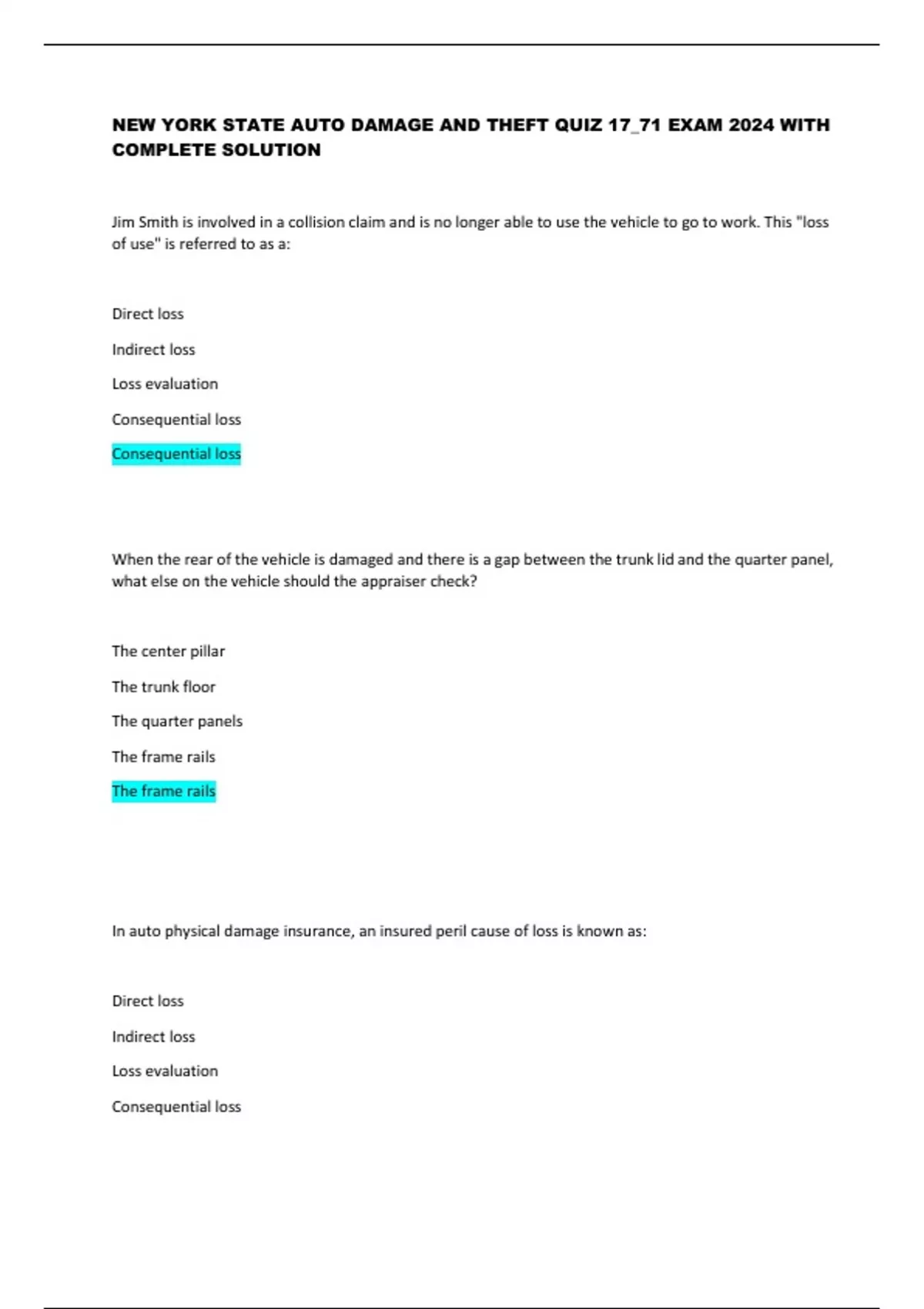 NEW YORK STATE AUTO DAMAGE AND THEFT QUIZ 17_71 EXAM 2024 WITH COMPLETE SOLUTION