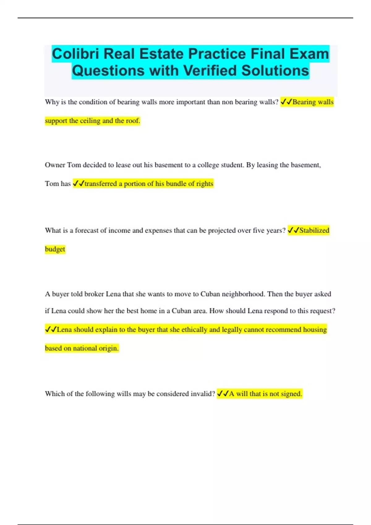 Colibri Real Estate Practice Final Exam Questions with Verified Solutions Why is the condition of bearing walls more important than non bearing walls? Bearing walls support the ceiling and the roof. Owner Tom decided to lease out his basement to a college student. By leasing the basement, Tom has transferred a portion of his bundle of rights What is a forecast of income and expenses that can be projected over five years? Stabilized budget A buyer told broker Lena that she wants to move to Cuban neighborhood. Then the buyer asked if Lena could show her the best home in a Cuban area. How should Lena respond to this request? Lena should explain to the buyer that she ethically and legally cannot recommend housing based on national origin. Which of the following wills may be considered invalid? A will that is not signed. Broker Torrey hires salesperson Wes as an independent contractor. As an independent contractor, Wes can expect which of the following from Broker Torrey? Performance Expectations Which of the following statements best describes what happens with a judicial foreclosure? The mortgaged property is sold under the supervision of a court. Which of the following best describes the principle of conformity? A home maintains its highest value by being in a neighborhood with similar-type housing. The cost of doing direct mail advertising depends on The frequency of the mailings A type of mortgage which allows the lender to increase the outstanding balance of a loan up to the original amount of the loan in order to advance additional funds is called an open-end mortgage Of the following liens: a $100,000 mortgage, a $2,500 property tax bill, and a $8,000 mechanic's lien and a $25,000 judgement lien, which will be paid off first after a foreclosure sale? The $2,500 property tax lien On a $280,000 loan, the lender charges a 2 point service charge. How much does the borrower have to pay for just these two points? $5,600 A seller decided to back out of a sales contract for no good reason. What recourse does the buyer have? To sue for specific performance. What are the primary advantages of PEX piping? PEX piping is able to withstand both high and low temperatures and it is highly resistant to chemicals. How does Planned Unit Development zoning differ from ordinary zoning? I requires that multiple tracts of land be developed according to a single design for efficient use of space. Home Hoarding Realty is advertising to the public that their managing broker has been in the business 37 years and has sold over 1,250 homes. This is an example of institutional advertising Which of the following would qualify as an example of retail property? A shopping center Neal's home has been foreclosed on and sold at a Sheriff's sale. The sale brought in $500,000 and the total liabilities on the home were $425,000. Who receives the additional $75,000? Neal Broker Jon is attaching a rider strip to a For Sale sign. What information is most likely on this rider strip? Jon's cell phone number Which is false regarding a promissory note? It is the term used for a note that is guaranteed or insured by a governmental agency. What is a disadvatage of real estate investment? It is not highly liquid A broker induces an owner to sell by telling him that Muslims are moving into the neighborhood. This broker is guilty of blockbusting Given the net income of a property, the appraiser