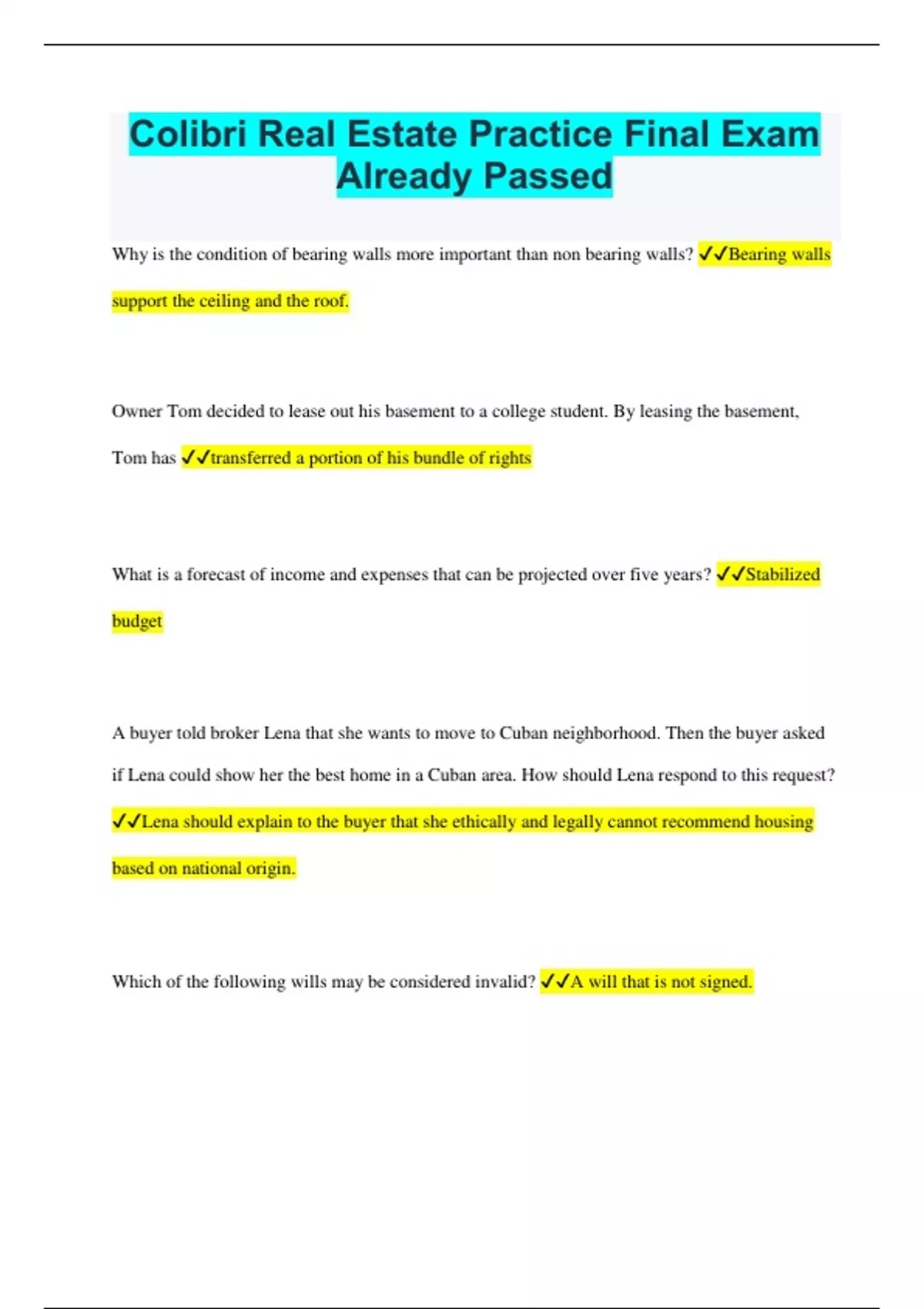 Colibri Real Estate Practice Final Exam Already Passed Why is the condition of bearing walls more important than non bearing walls? Bearing walls support the ceiling and the roof. Owner Tom decided to lease out his basement to a college student. By leasing the basement, Tom has transferred a portion of his bundle of rights What is a forecast of income and expenses that can be projected over five years? Stabilized budget A buyer told broker Lena that she wants to move to Cuban neighborhood. Then the buyer asked if Lena could show her the best home in a Cuban area. How should Lena respond to this request? Lena should explain to the buyer that she ethically and legally cannot recommend housing based on national origin. Which of the following wills may be considered invalid? A will that is not signed. Broker Torrey hires salesperson Wes as an independent contractor. As an independent contractor, Wes can expect which of the following from Broker Torrey? Performance Expectations Which of the following statements best describes what happens with a judicial foreclosure? The mortgaged property is sold under the supervision of a court. Which of the following best describes the principle of conformity? A home maintains its highest value by being in a neighborhood with similar-type housing. The cost of doing direct mail advertising depends on The frequency of the mailings A type of mortgage which allows the lender to increase the outstanding balance of a loan up to the original amount of the loan in order to advance additional funds is called an open-end mortgage Of the following liens: a $100,000 mortgage, a $2,500 property tax bill, and a $8,000 mechanic's lien and a $25,000 judgement lien, which will be paid off first after a foreclosure sale? The $2,500 property tax lien On a $280,000 loan, the lender charges a 2 point service charge. How much does the borrower have to pay for just these two points? $5,600 A seller decided to back out of a sales contract for no good reason. What recourse does the buyer have? To sue for specific performance. What are the primary advantages of PEX piping? PEX piping is able to withstand both high and low temperatures and it is highly resistant to chemicals. How does Planned Unit Development zoning differ from ordinary zoning? I requires that multiple tracts of land be developed according to a single design for efficient use of space. Home Hoarding Realty is advertising to the public that their managing broker has been in the business 37 years and has sold over 1,250 homes. This is an example of institutional advertising Which of the following would qualify as an example of retail property? A shopping center Neal's home has been foreclosed on and sold at a Sheriff's sale. The sale brought in $500,000 and the total liabilities on the home were $425,000. Who receives the additional $75,000? Neal Broker Jon is attaching a rider strip to a For Sale sign. What information is most likely on this rider strip? Jon's cell phone number Which is false regarding a promissory note? It is the term used for a note that is guaranteed or insured by a governmental agency. What is a disadvatage of real estate investment? It is not highly liquid A broker induces an owner to sell by telling him that Muslims are moving into the neighborhood. This broker is guilty of blockbusting Given the net income of a property, the appraiser can determine an opinion of the value for that property by Dividing by the rate of capitalization Morgan owned a large condominium on the ocean. She died and no legal heirs were found. Who will receive title to the property? The State or County Earl orally agreed to a 18-month lease with landlord Blake. Is this contract enforceable? No, all leases for longer than one year must be in writing to be enforceable. Which of the following types of property sales typically requires a property condition disclosure? A three unit, multi-family dwelling Broker Jack has an agreement with seller Mauve that says Jack will receive compensation if anyone except Mauve sells Mauve's home. This is an example of Exclusive Agency Which clause protects a lender if he does not want the loan to be assumed by another party? Alienation Which of the following would be found in a management proposal? Schedule of maintenance requirements Which principle is used with the Sales Comparison