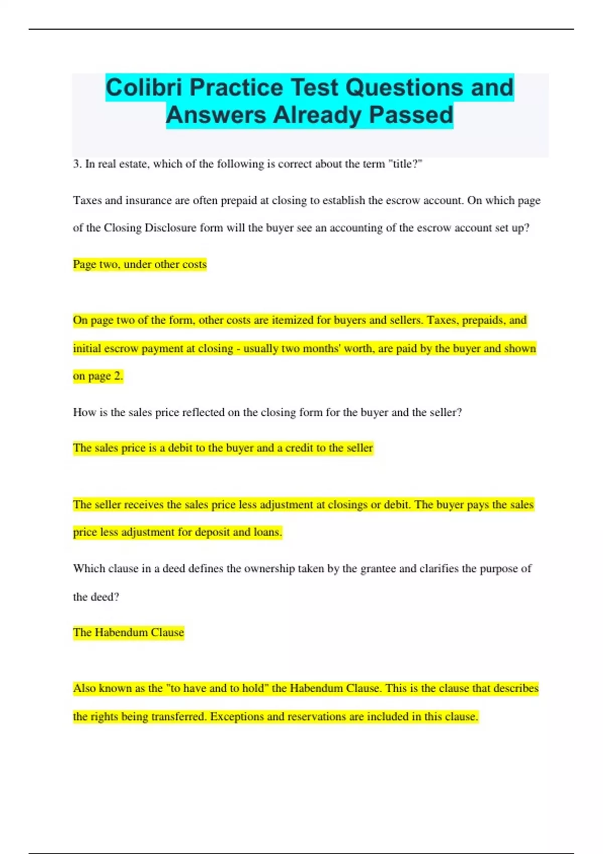 Colibri Practice Test Questions and Answers Already Passed 3. In real estate, which of the following is correct about the term "title?" Taxes and insurance are often prepaid at closing to establish the escrow account. On which page of the Closing Disclosure form will the buyer see an accounting of the escrow account set up? Page two, under other costs On page two of the form, other costs are itemized for buyers and sellers. Taxes, prepaids, and initial escrow payment at closing - usually two months' worth, are paid by the buyer and shown on page 2. How is the sales price reflected on the closing form for the buyer and the seller? The sales price is a debit to the buyer and a credit to the seller The seller receives the sales price less adjustment at closings or debit. The buyer pays the sales price less adjustment for deposit and loans. Which clause in a deed defines the ownership taken by the grantee and clarifies the purpose of the deed? The Habendum Clause Also known as the "to have and to hold" the Habendum Clause. This is the clause that describes the rights being transferred. Exceptions and reservations are included in this clause. When a cap rate used with income capitalization is high, the following relationship with sales price exists: risk and cap rate are higher, the sales price is usually lower. Cap rate is likened to the risk factor when purchasing an investment property - a high cap rate indicates high risk, and often the sales price is lower. Property is located next to a busy freeway; semi-trucks use the freeway all night long. After two years on the market, the seller reduced his price by 25%. Which loss of value has occurred? Economic or external obsolescence Economic or external obsolescence is a loss of value outside of the perimeter boundary of the property, beyond the owner's control, and almost always incurable. A homestead exemption in Florida is available to those who qualify and file documents making the Florida home a primary residence. The base homestead exemption is: $25,000 The base homestead exemption is $25,000. There is an additional $25,000 available for qualified property owners; however, the additional $25,000 does NOT apply to school taxes. A closing is March 5 for a rental property with an annual tax bill of $2800. Calculate and show the debit and credits for the tax proration between the buyer and seller using the 365-day method, the day of closing belongs to the buyer. debit seller $483.29; credit buyer $483.29 The purpose of proration is to assign the amount owed to the responsible party. The taxes will be paid by the buyer at the end of the year. The buyer needs money from the seller for the days that the seller owned. $2800/365 = $7.67 per day. Jan = 31 days, Feb. = 28 days and March = 4 day total 63 X $7.67 = $483.21 that the seller owes for the time he owned. NOTE: The amount taken from the seller is given to the buyer - it is the same amount. Use 3 decimal places and don't clear the calculator between steps. John is a sales associate who has complaints against him for making false statements about the property and for giving advice about the purchase contract. This is the third time these same violations have been investigated. If John is found guilty of violating these two practices at the formal hearing, the maximum fine John can face is: 10,000 For second and subsequent violations, $2500 to $5000 fine and suspension for up to six years or revocation. The fine is $5000 maximum for each offense. A deed and a real estate purchase agreement would not be considered valid without: an adequate legal description. The property must be accurately described in any purchase agreement and deed, so there is no question about what is being transferred. In a deed, the legal