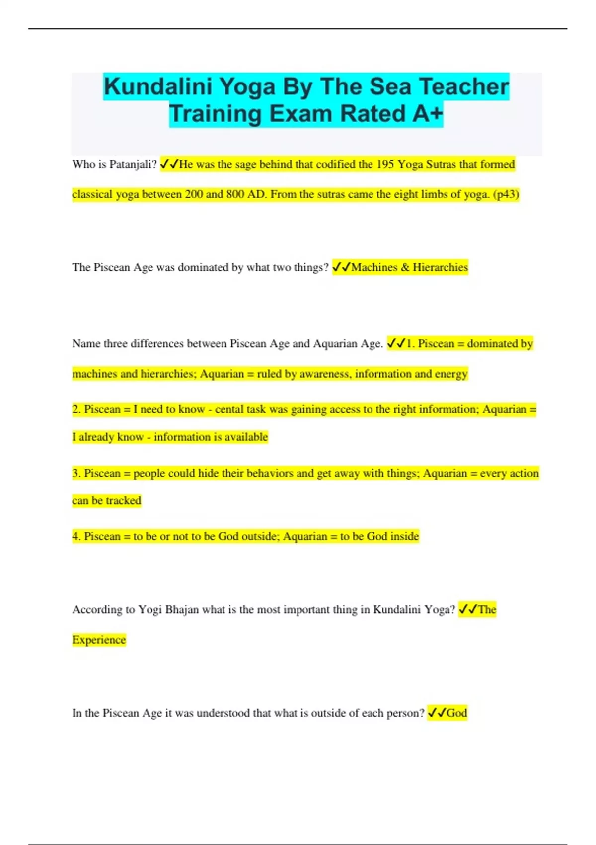 Kundalini Yoga By The Sea Teacher Training Exam Rated A+ Who is Patanjali? He was the sage behind that codified the 195 Yoga Sutras that formed classical yoga between 200 and 800 AD. From the sutras came the eight limbs of yoga. (p43) The Piscean Age was dominated by what two things? Machines & Hierarchies Name three differences between Piscean Age and Aquarian Age. 1. Piscean = dominated by machines and hierarchies; Aquarian = ruled by awareness, information and energy 2. Piscean = I need to know - cental task was gaining access to the right information; Aquarian = I already know - information is available 3. Piscean = people could hide their behaviors and get away with things; Aquarian = every action can be tracked 4. Piscean = to be or not to be God outside; Aquarian = to be God inside According to Yogi Bhajan what is the most important thing in Kundalini Yoga? The Experience In the Piscean Age it was understood that what is outside of each person? God In the Aquarian Age it was understood that what is within each of us? God In the aquarian age there is no what? Secrecy In the Piscean Age it was important to get access to the right information that was available to who? Only a select few Through kundalini yoga your sensitivity grows through what? The Self Sensory System The motto of the aquarian age is what? Be to be The Motto of the Piscean age was what? To be or not to be. What does the word Yoga mean? The union of the mind, body, and spirit. Yoga is a relationship. It comes from the biblical word yoke, which means to unite. Yoga is the union of the individual's finite consciousness with the Infinite Consciousness. (p14) What is White Tantric Yoga? WTY is done under the guidance of a Mahan Tantric. It is done in pairs as a group meditation. It consists of 6 to 8 kriyas each day. WTY enables you to break through subconscious blocks to gain a deeper understanding of yourself. Opens you to blessings you already have. (p33, 138) What type of yoga is action in service to the boundless will of the soul? Karma Yoga How does Kundalini Yoga work? Kundalini Yoga mixes Prana and Apana to raise the kundalini. The two meet at the naval and go up at the Sushmana. Kundalini means awareness. Works on all systems of the physical body, including the glandular and nervous system. It develops your relationship to your mental potential. You learn to use the clarity of the neutral, intuitive, comprehensive mind. (p24). An awareness of the infinite happens when the kundalini or spiritual nerve breaks through blocks at the base of the spine or root chakra and travels upward. Patanjali identified 8 aspects of yoga known as what? The 8 limbs of yoga. List the 8 limbs of yoga and match them with their correct description. 1. Yama - 5 restraints 2. Niyama - 5 disciplines 3. Asana - Postures for health and meditation 4. Pranayam - Control of prana (life force) 5. Pratyahar - synchronization of senses and thoughts 6. Dharana - one-pointed concentration 7. Dhyana - deep meditation 8. Samadhi - Awakening and absorption in spirit Please describe why it is important to know the basic philosophy of yoga and the history of philosophy as a yogi and a yoga teacher? So you can pass on the wisdom correctly and honor your teachers. It allows us to put perspective in our teaching to the search for truth that started long before us and will continue long after. How do Kundalini Yoga and Hatha Yoga differ? 1.