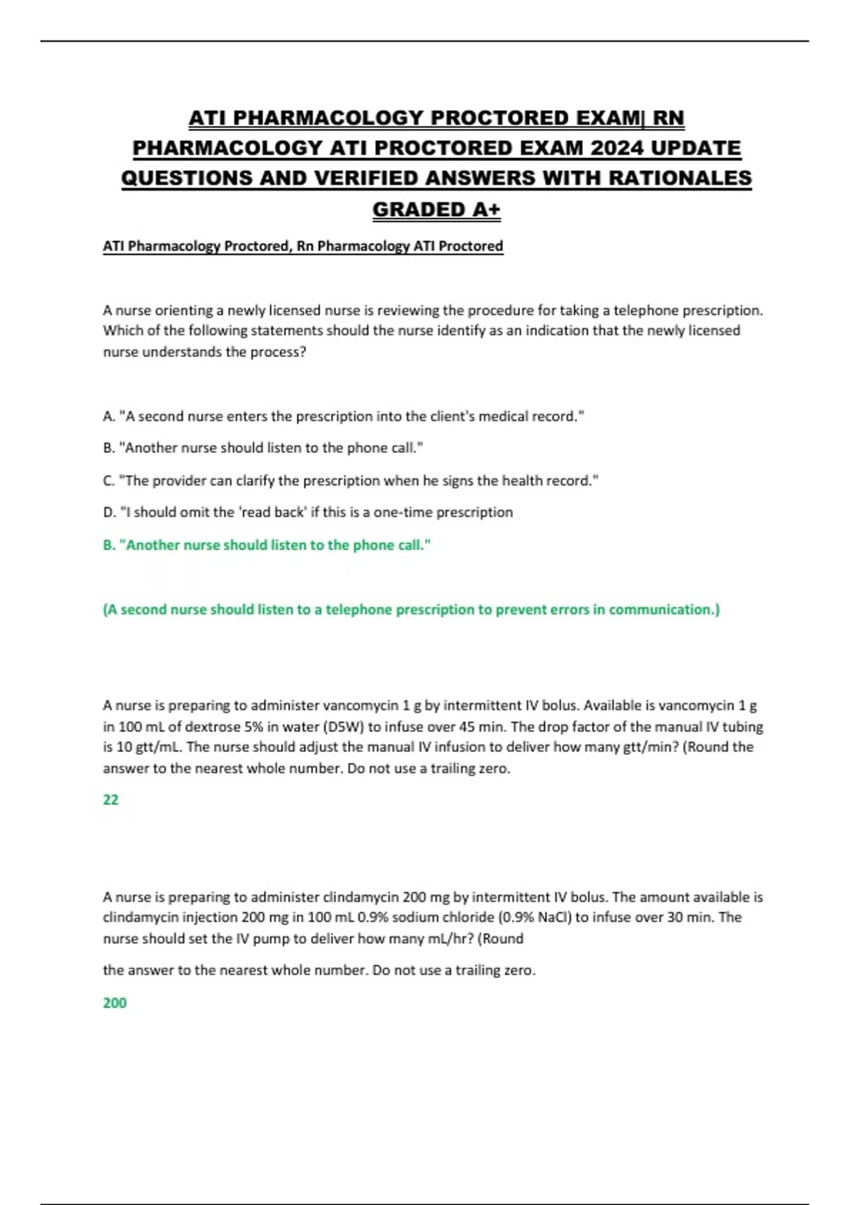 ATI PHARMACOLOGY PROCTORED EXAM| RN PHARMACOLOGY ATI PROCTORED EXAM 2024 UPDATE QUESTIONS AND VERIFIED ANSWERS WITH RATIONALES GRADED A+ A nurse orienting a newly licensed nurse is reviewing the procedure for taking a telephone prescription. Which of the following statements should the nurse identify as an indication that the newly licensed nurse understands the process? A. "A second nurse enters the prescription into the client's medical record." B. "Another nurse should listen to the phone call." C. "The provider can clarify the prescription when he signs the health record." D. "I should omit the 'read back' if this is a one‑time prescription B. "Another nurse should listen to the phone call." (A second nurse should listen to a telephone prescription to prevent errors in communication.) A nurse is preparing to administer vancomycin 1 g by intermittent IV bolus. Available is vancomycin 1 g in 100 mL of dextrose 5% in water (D5W) to infuse over 45 min. The drop factor of the manual IV tubing is 10 gtt/mL. The nurse should adjust the manual IV infusion to deliver how many gtt/min? (Round the answer to the nearest whole number. Do not use a trailing zero. 22 A nurse is preparing to administer clindamycin 200 mg by intermittent IV bolus. The amount available is clindamycin injection 200 mg in 100 mL 0.9% sodium chloride (0.9% NaCl) to infuse over 30 min. The nurse should set the IV pump to deliver how many mL/hr? (Round the answer to the nearest whole number. Do not use a trailing zero. 200