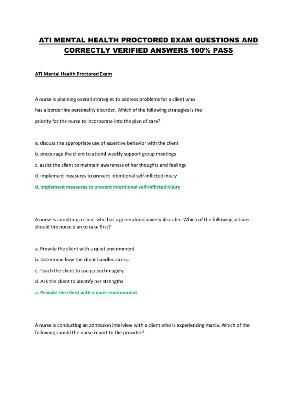 ATI MENTAL HEALTH PROCTORED EXAM QUESTIONS AND CORRECTLY VERIFIED ANSWERS 100% PASS ATI MENTAL HEALTH PROCTORED EXAM QUESTIONS AND CORRECTLY VERIFIED ANSWERS 100% PASS ATI Mental Health Proctored Exam A nurse is planning overall strategies to address problems for a client who has a borderline personality disorder. Which of the following strategies is the priority for the nurse to incorporate into the plan of care? a. discuss the appropriate use of assertive behavior with the client b. encourage the client to attend weekly support group meetings c. assist the client to maintain awareness of her thoughts and feelings d. implement measures to prevent intentional self-inflicted injury d. implement measures to prevent intentional self-inflicted injury A nurse is admitting a client who has a generalized anxiety disorder. Which of the following actions should the nurse plan to take first? a. Provide the client with a quiet environment b. Determine how the client handles stress. c. Teach the client to use guided imagery. d. Ask the client to identify her strengths a. Provide the client with a quiet environment A nurse is conducting an admission interview with a client who is experiencing mania. Which of the following should the nurse report to the provider? a. States that he hasn't bathed in 2 days b. Reports eating twice in the past two weeks. c. Makes inappropriate sexual comments. d. Speaks in rhyming sentences. b. Reports eating twice in the past two weeks.