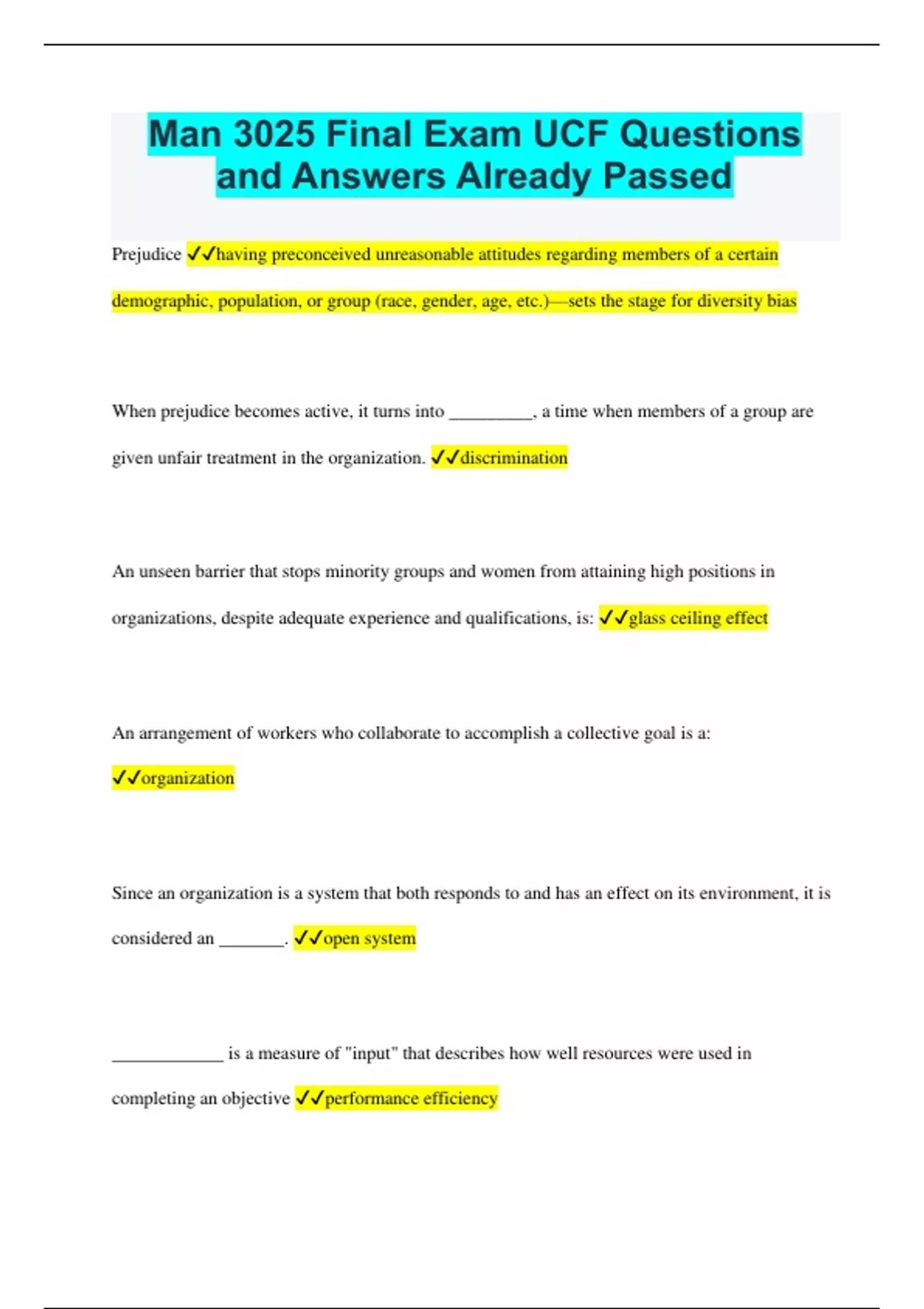 Man 3025 Final Exam UCF Questions and Answers Already Passed