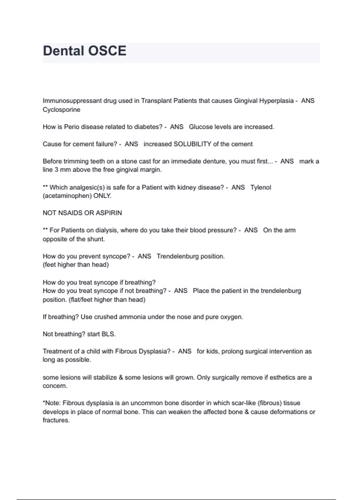 Dental OSCE Exam Questions And Answers Immunosuppressant drug used in Transplant Patients that causes Gingival Hyperplasia - ANS Cyclosporine How is Perio disease related to diabetes? - ANS Glucose levels are increased. Cause for cement failure? - ANS increased SOLUBILITY of the cement Before trimming teeth on a stone cast for an immediate denture, you must first... - ANS mark a line 3 mm above the free gingival margin. ** Which analgesic(s) is safe for a Patient with kidney disease? - ANS Tylenol (acetaminophen) ONLY. NOT NSAIDS OR ASPIRIN ** For Patients on dialysis, where do you take their blood pressure? - ANS On the arm opposite of the shunt. How do you prevent syncope? - ANS Trendelenburg position. (feet higher than head) How do you treat syncope if breathing? How do you treat syncope if not breathing? - ANS Place the patient in the trendelenburg position. (flat/feet higher than head) If breathing? Use crushed ammonia under the nose and pure oxygen. Not breathing? start BLS. Treatment of a child with Fibrous Dysplasia? - ANS for kids, prolong surgical intervention as long as possible. some lesions will stabilize & some lesions will grown. Only surgically remove if esthetics are a concern. *Note: Fibrous dysplasia is an uncommon bone disorder in which scar-like (fibrous) tissue develops in place of normal bone. This can weaken the affected bone & cause deformations or fractures. *Radiographic appearance: orange peel if late stage. ** Treatment of barbiturate allergic reaction. - ANS antihistamine (synergic reaction to barbiturate) ** look at this. **Can you treat a patient who had Hepatitis A, one year ago? - ANS yes. they can be treated "1 week after having jaundice" -- the exam referred to it as jaundice. At what intervals are intermediate dentures evaluated? - ANS 24- hrs. 72- hrs. 1 week 1 month Every 3 months **How long to keep a dressing on after periodontal treatment? - ANS Pack is kept in for 1 week after surgery. TX for Primary herpetic gingivostomatitis? - ANS Palliative only - you only treat for fever and pain. Eagles Syndrome symptoms - ANS Pain while swallowing, turning head, or mouth opening. may include dysphagia, dysphonia, otalgia, headaches, dizziness. * The elongation of styloid process// mineralization of the stylohyoid ligament.