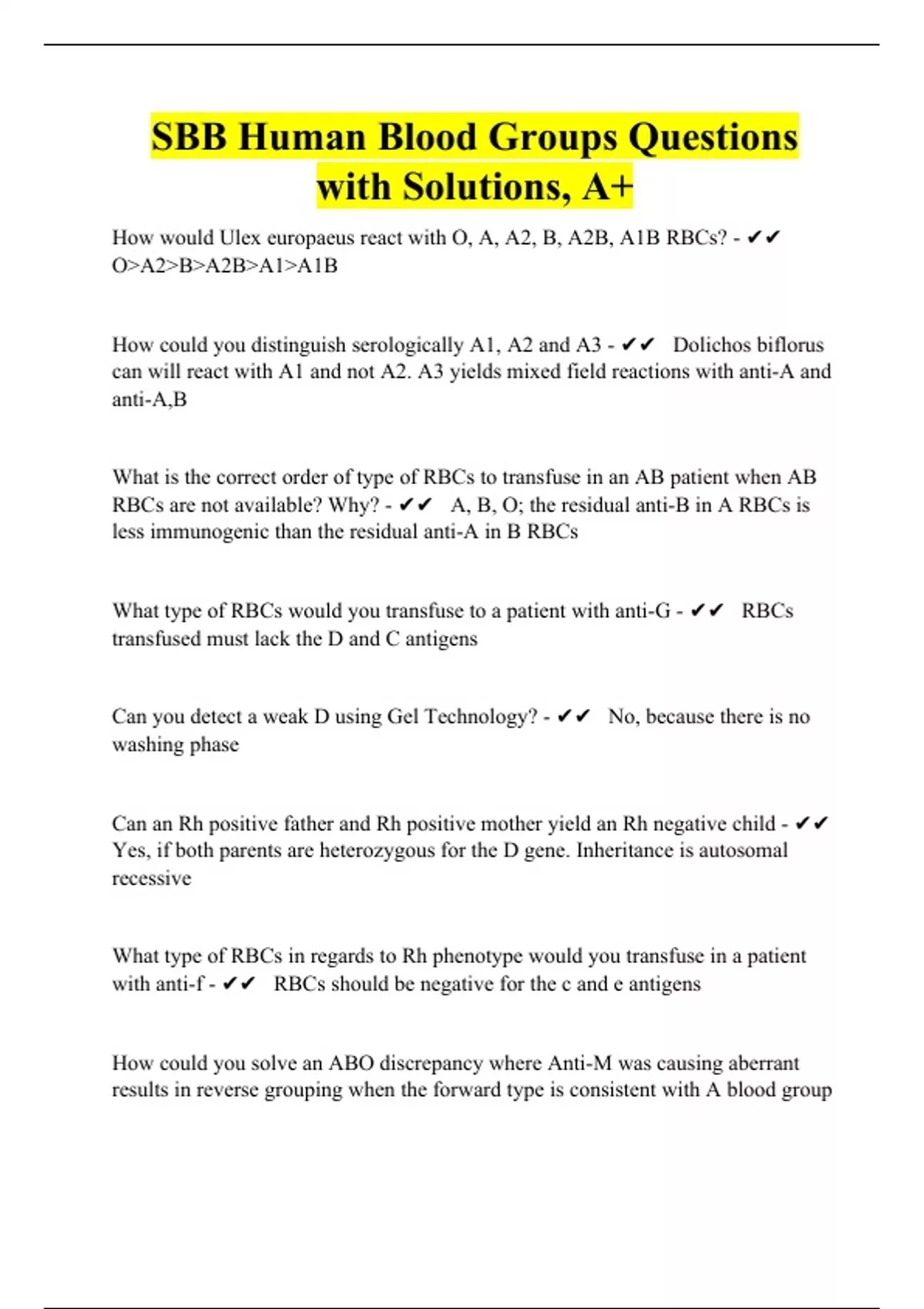 SBB Human Blood Groups Questions with Solutions, A+