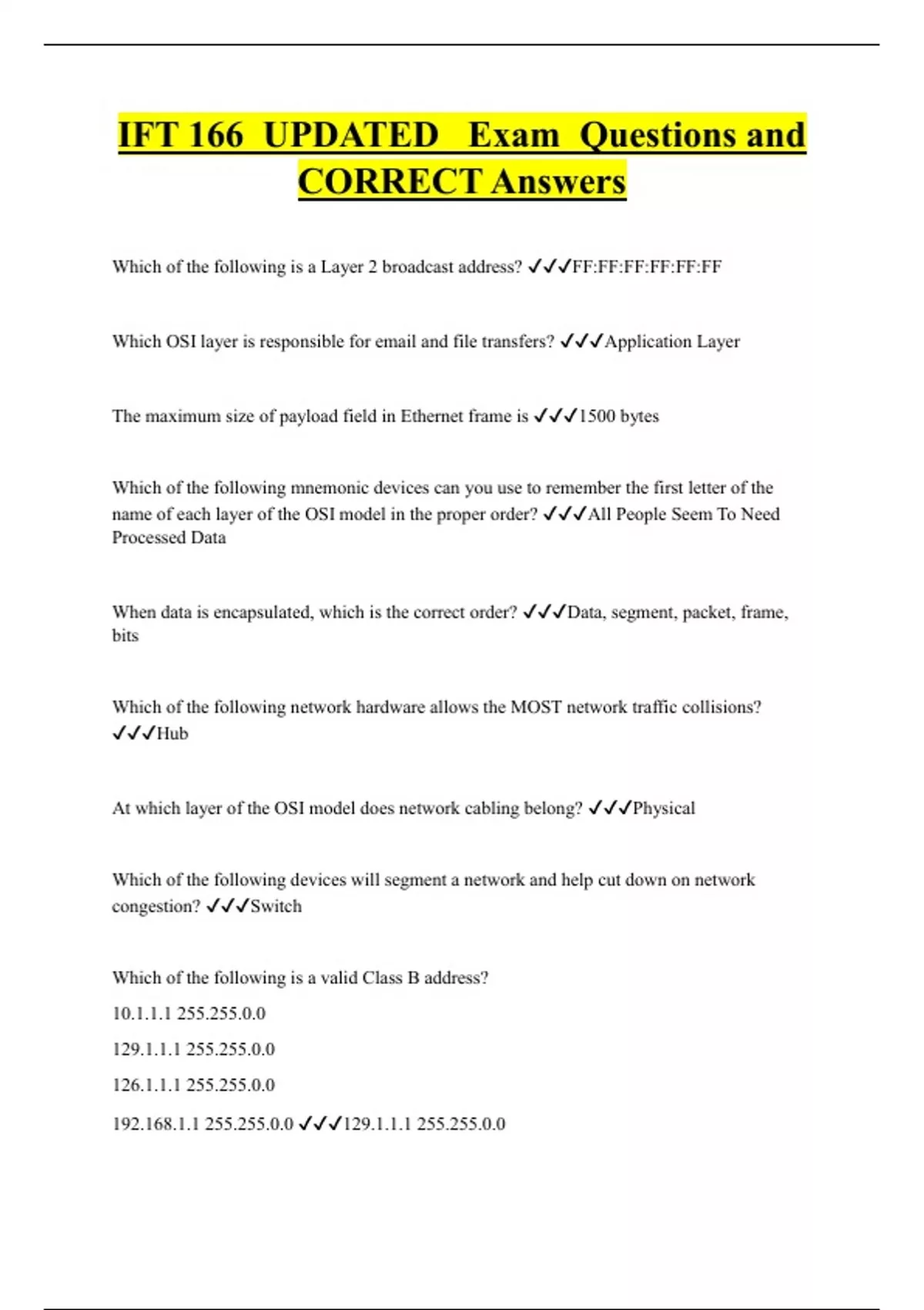 Which of the following is a Layer 2 broadcast address? FF:FF:FF:FF:FF:FF Which OSI layer is responsible for email and file transfers? Application Layer The maximum size of payload field in Ethernet frame is 1500 bytes Which of the following mnemonic devices can you use to remember the first letter of the name of each layer of the OSI model in the proper order? All People Seem To Need Processed Data When data is encapsulated, which is the correct order? Data, segment, packet, frame, bits Which of the following network hardware allows the MOST network traffic collisions? Hub