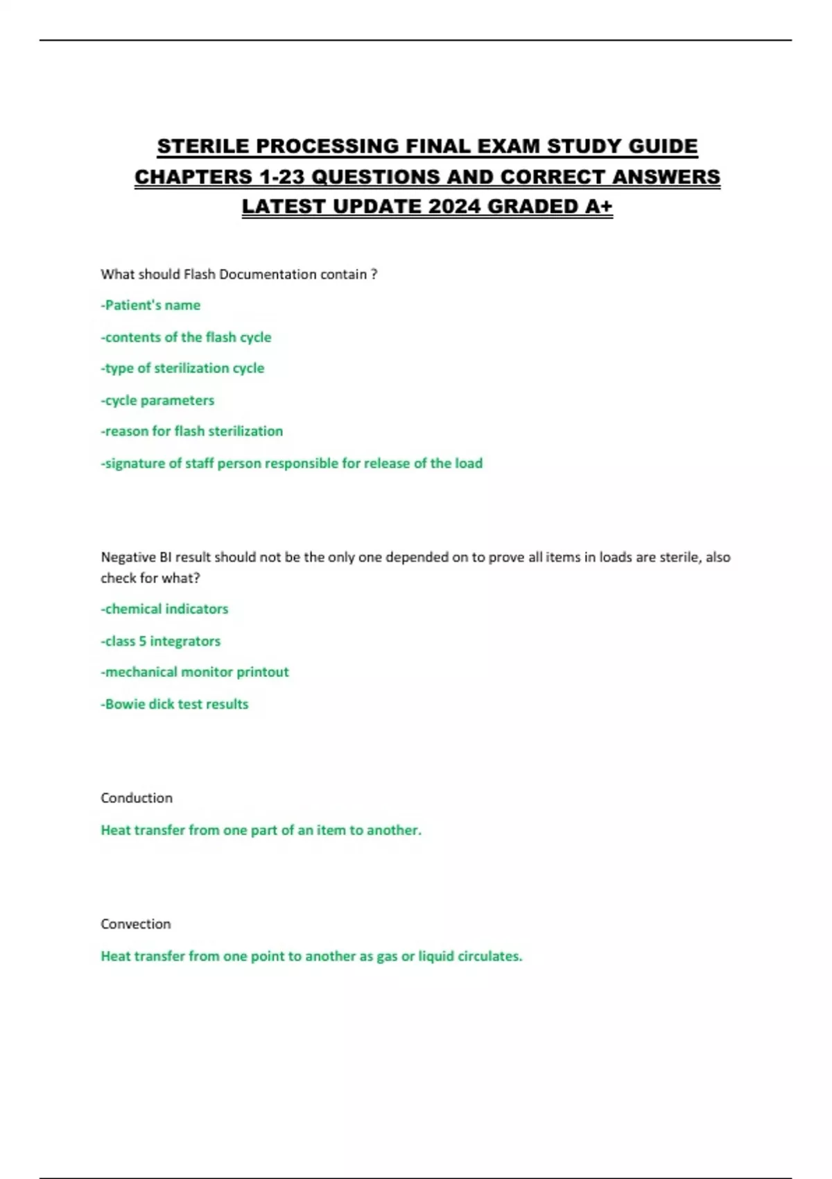 STERILE PROCESSING FINAL EXAM STUDY GUIDE CHAPTERS 1-23 QUESTIONS AND CORRECT ANSWERS LATEST UPDATE 2024 GRADED A+