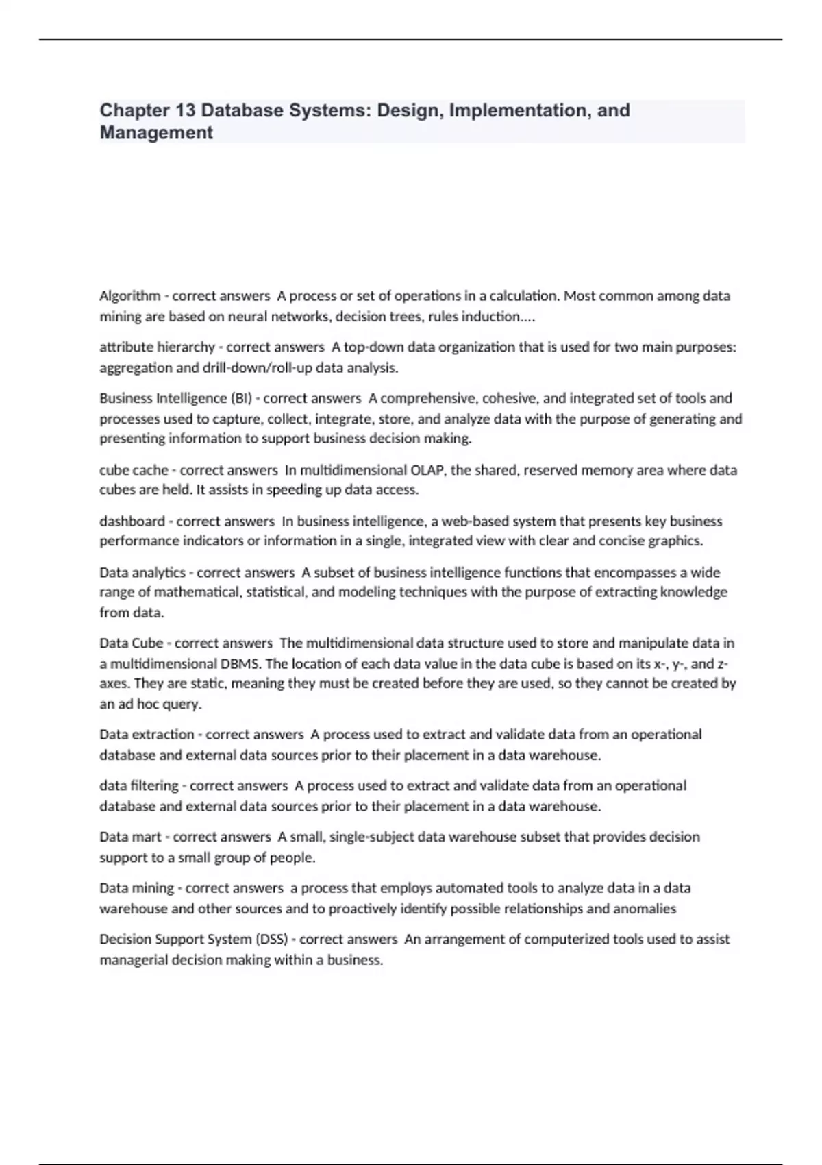 Chapter 13 Database Systems: Design, Implementation, and Management Algorithm - correct answers A process or set of operations in a calculation. Most common among data mining are based on neural networks, decision trees, rules induction.... attribute hierarchy - correct answers A top-down data organization that is used for two main purposes: aggregation and drill-down/roll-up data analysis. Business Intelligence (BI) - correct answers A comprehensive, cohesive, and integrated set of tools and processes used to capture, collect, integrate, store, and analyze data with the purpose of generating and presenting information to support business decision making. cube cache - correct answers In multidimensional OLAP, the shared, reserved memory area where data cubes are held. It assists in speeding up data access. dashboard - correct answers In business intelligence, a web-based system that presents key business performance indicators or information in a single, integrated view with clear and concise graphics. Data analytics - correct answers A subset of business intelligence functions that encompasses a wide range of mathematical, statistical, and modeling techniques with the purpose of extracting knowledge from data. Data Cube - correct answers The multidimensional data structure used to store and manipulate data in a multidimensional DBMS. The location of each data value in the data cube is based on its x-, y-, and z-axes. They are static, meaning they must be created before they are used, so they cannot be created by an ad hoc query. Data extraction - correct answers A process used to extract and validate data from an operational database and external data sources prior to their placement in a data warehouse. data filtering - correct answers A process used to extract and validate data from an operational database and external data sources prior to their placement in a data warehouse. Data mart - correct answers A small, single-subject data warehouse subset that provides decision support to a small group of people. Data mining - correct answers a process that employs automated tools to analyze data in a data warehouse and other sources and to proactively identify possible relationships and anomalies Decision Support System (DSS) - correct answers An arrangement of computerized tools used to assist managerial decision making within a business.