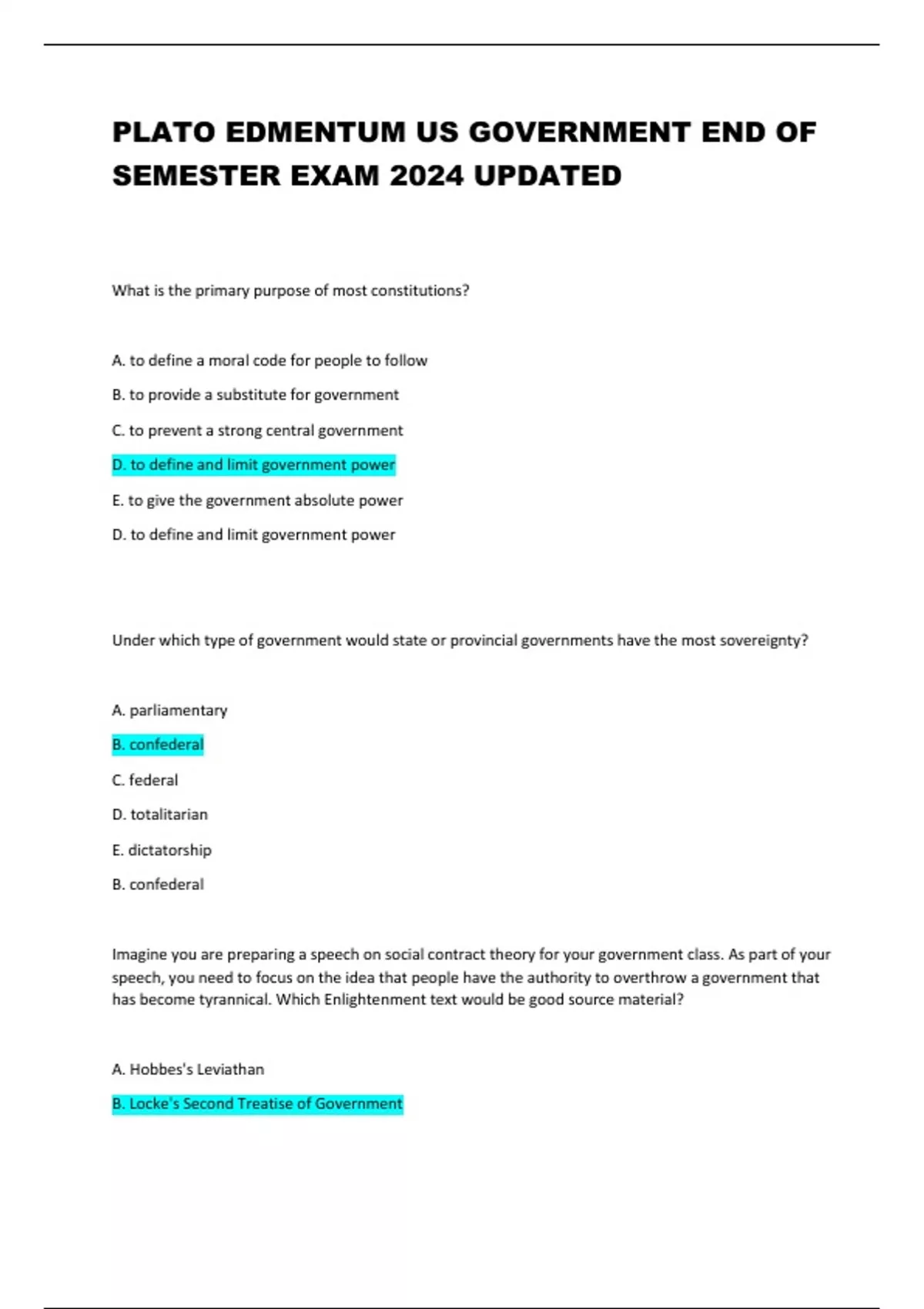 PLATO EDMENTUM US GOVERNMENT END OF SEMESTER EXAM 2024 UPDATED